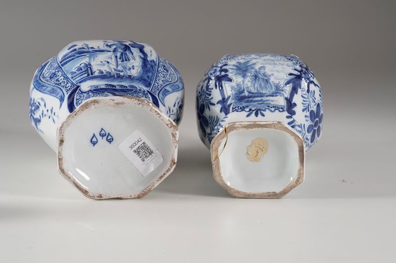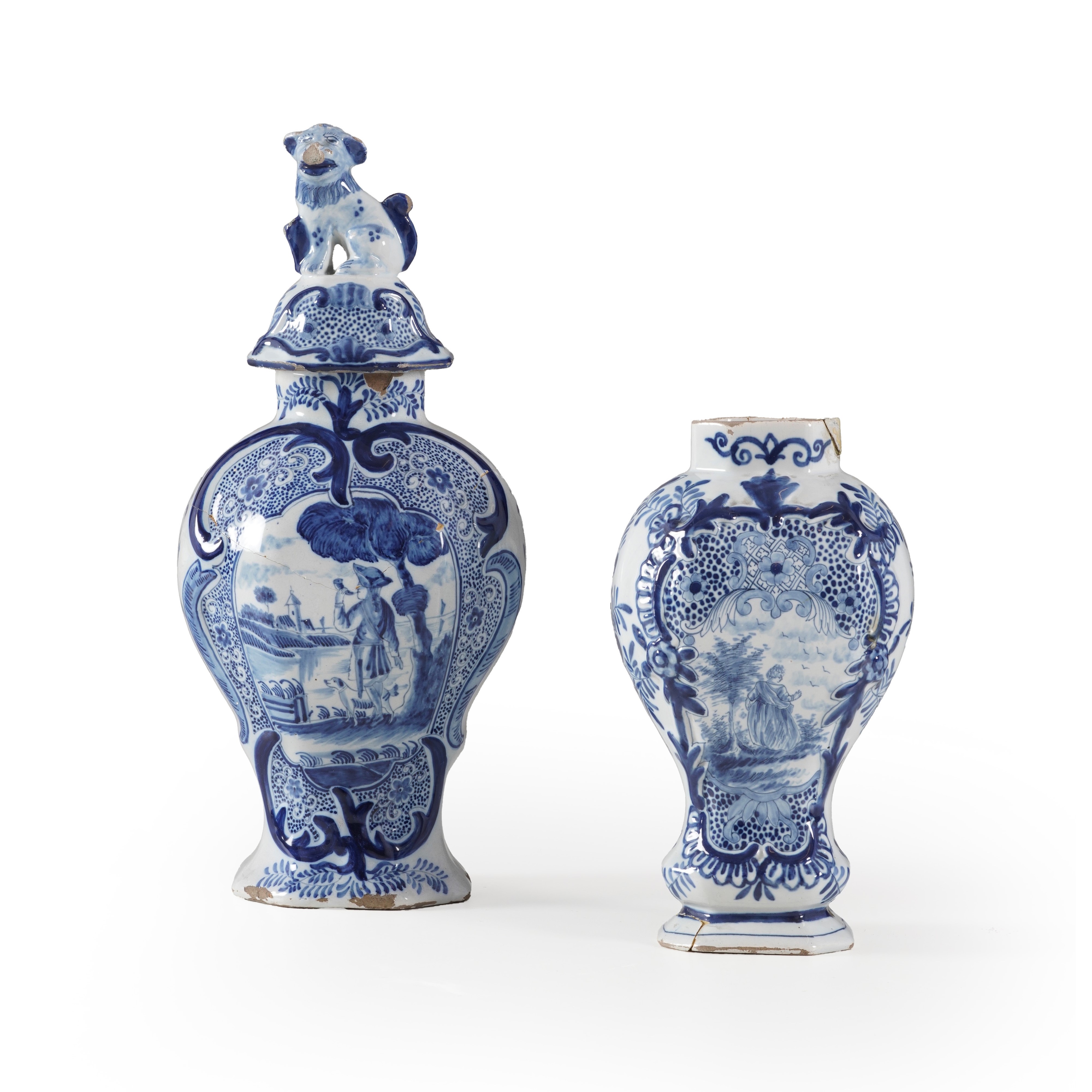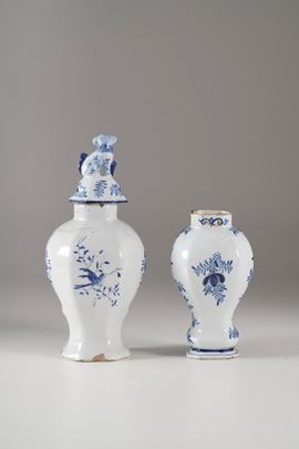 Potiche con coperchio a foggia di cane di Pho. Decoro monocromo a paesaggi entro riserve (rotture)