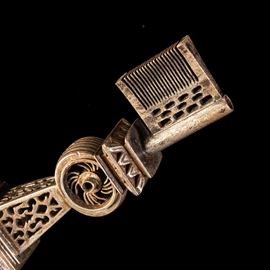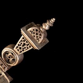 testa con rosone traforato al centro, sormontata da lanterna con pomello superiore che fa ruotare un capitello interno, vera quadrangolare traforata, fusto vuoto, mappa traforata con 14 lamelle fra due denti.