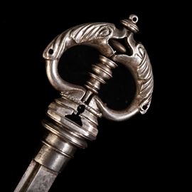 testa con due delfini contrapposti e colonna centrale di anelli girevoli, vera a più elementi ad anello, fusto triangolare con costola, mappa a pettine con intagli a disegno