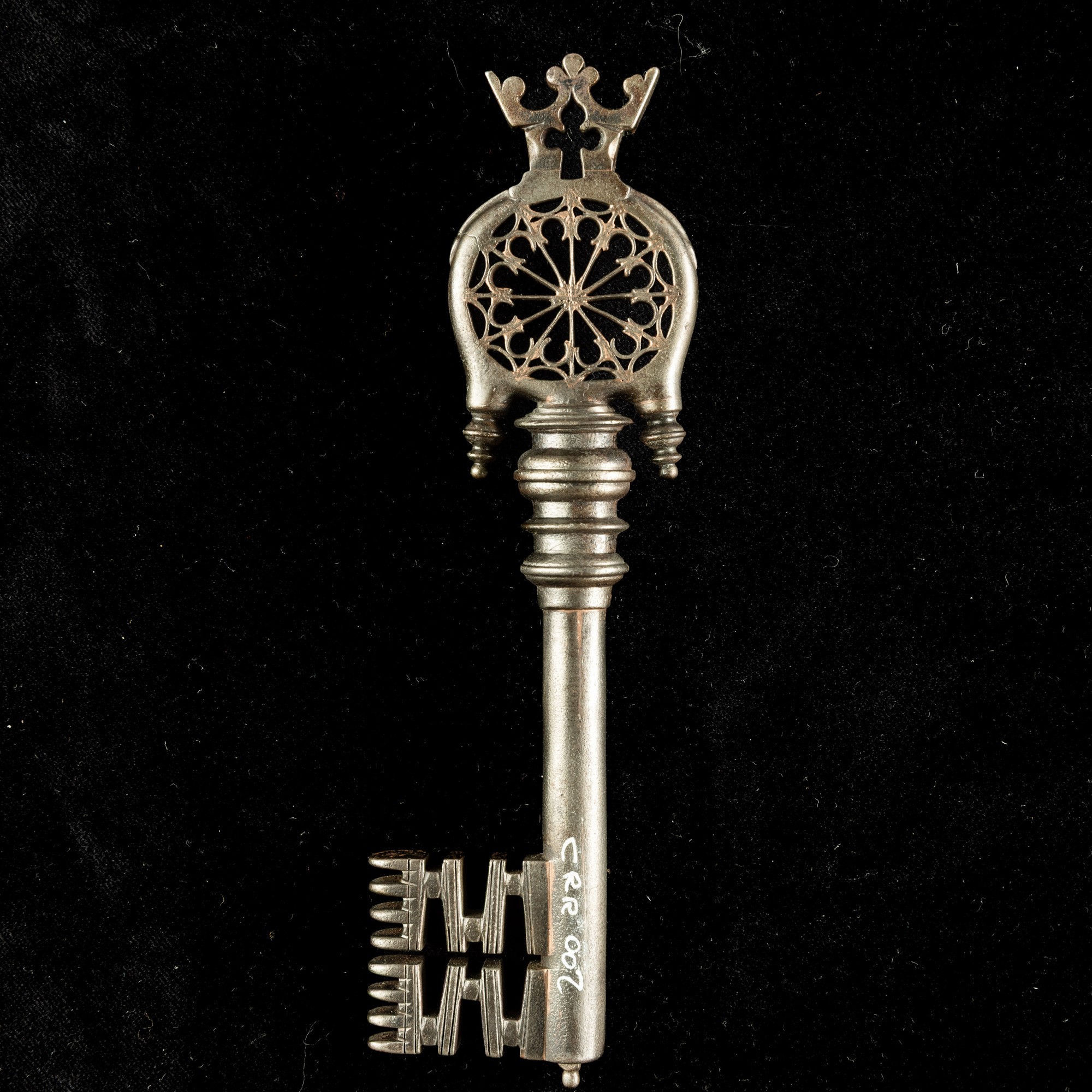 testa a rosone con lamelle radiali interne, corona superiore con intaglio centrale a croce e trifoglio terminale, due pendenti inferiori laterali, vera a più anelli, fusto forato con centratore, mappa in due ranghi con denti frontali