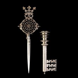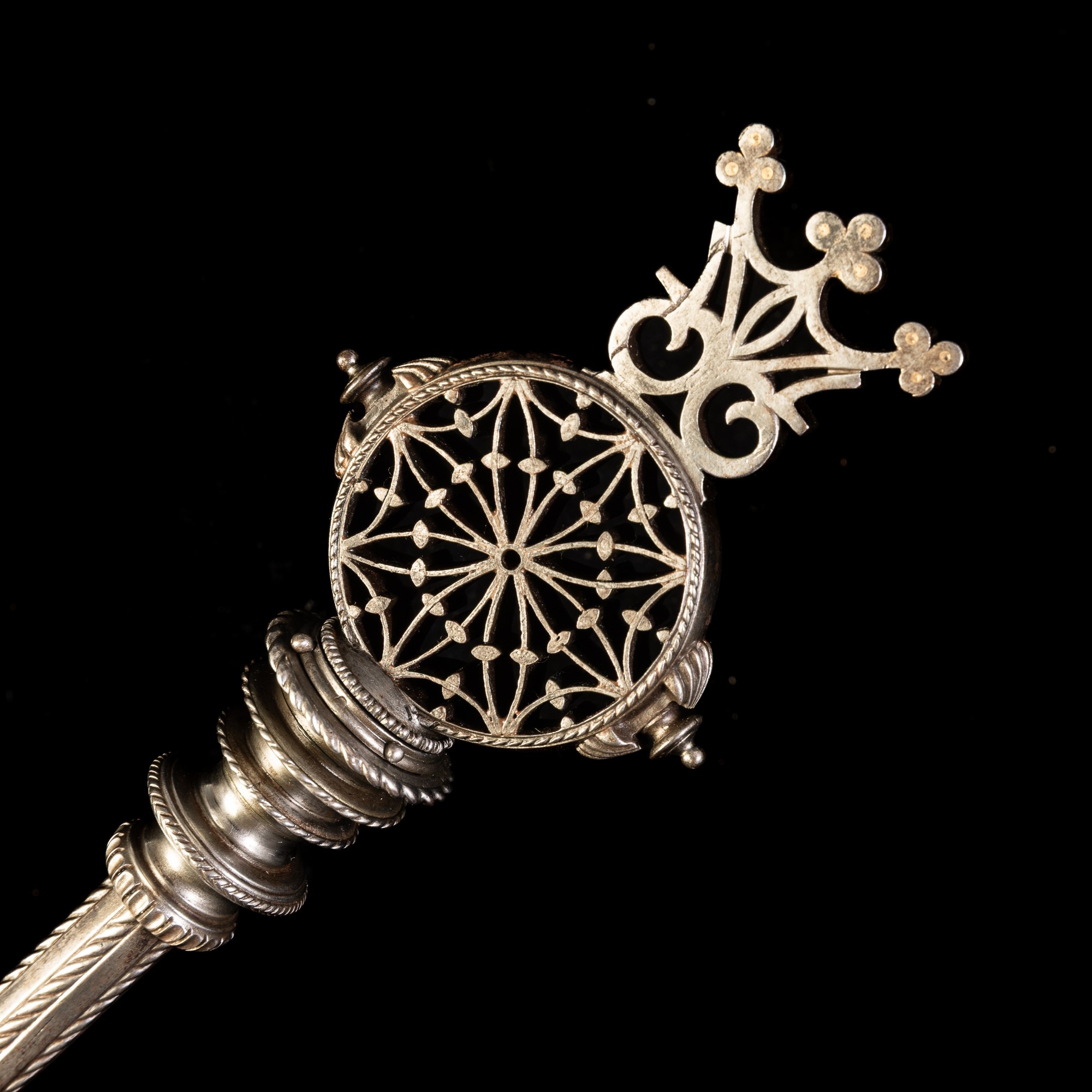 testa a rosone con lamelle radiali interne saldate tra loro e all’anello esterno scolpito a cordoncino, fregi all’estremità del diametro orizzontale per l’aggancio alla catena di sospensione, corona superiore a disegno complesso con trifogli sulle sporgenze terminali, vera a più anelli sovrapposti scolpiti, fusto vuoto esagonale con cordoncini scolpiti e centratore terminale, mappa a tre elementi sovrapposti con scolpiture alternate e denti frontali. Il fusto conserva al suo interno uno stiletto detto “misericordia” estraibile facendo ruotare in senso orario l’anello superiore della vera.