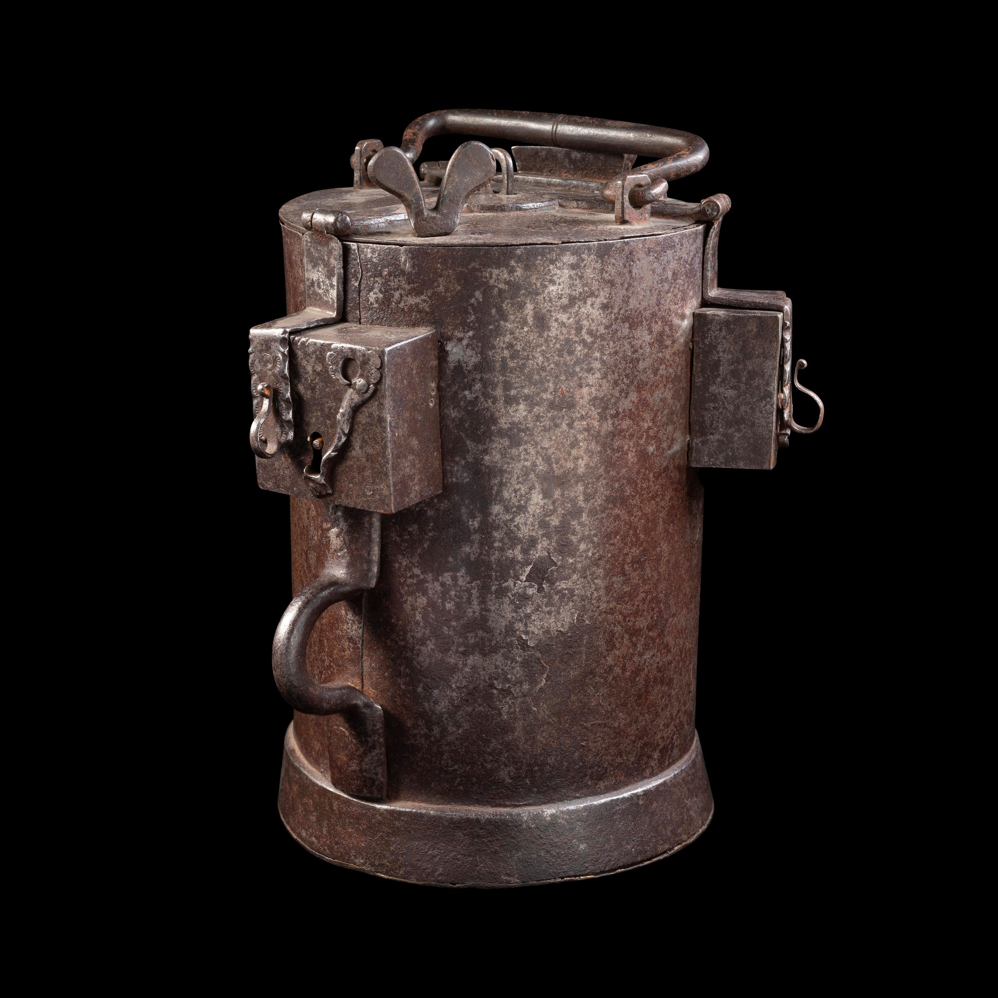 Elemosiniere salvadanaio cilindrico da confraternita in ferro. Germania meridionale, XVI secolo