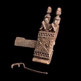 2- cm 22x6x29, serratura africana Dogon, XX secolo, corpo e catenaccio con scultura geometrica, testa con coppia antropomorfa;