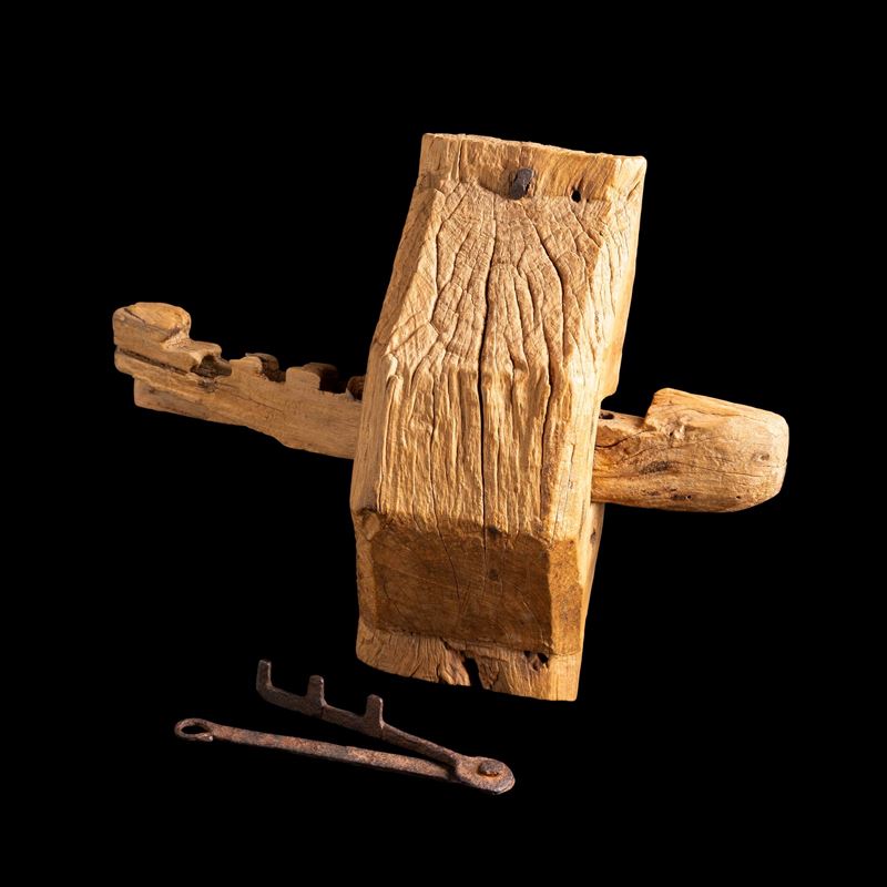 1- cm 38x6,5x28, serratura da portone in legno con ingegno di tipo egiziano azionato da chiave in ferro snodata. Puglia, XVIII secolo;