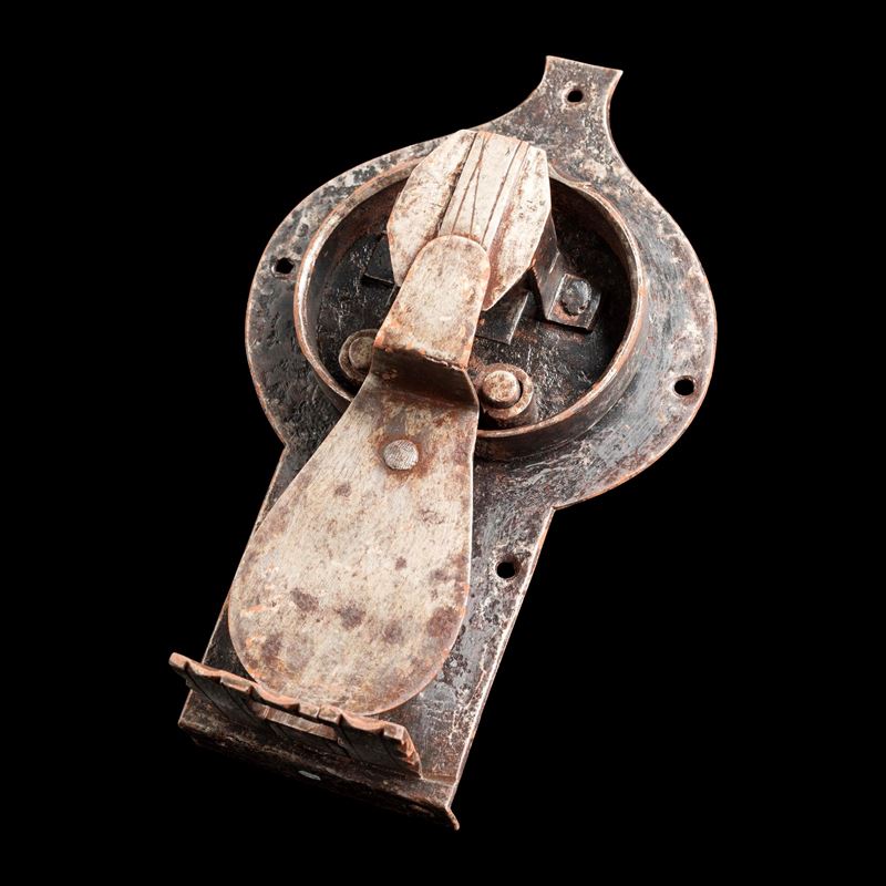 Le serrature “a testa di gatto” sono altri esempi dell’inventiva dei maestri serraturieri tedeschi del XVI secolo. Il nome deriva dalla somiglianza con la forma della testa di un felino, data dalla presenza di una molla di spinta a cerchio collocata sulla piastra, solitamente bilobata. La chiave serviva solo per l’apertura perché la chiusura avveniva automaticamente a scatto quando si abbassava il coperchio del cassone. La mappa della chiave spinge lateralmente due denti a tenaglia, liberando un gancio triangolare applicato all’interno del coperchio del cassone, consentendone l’apertura.