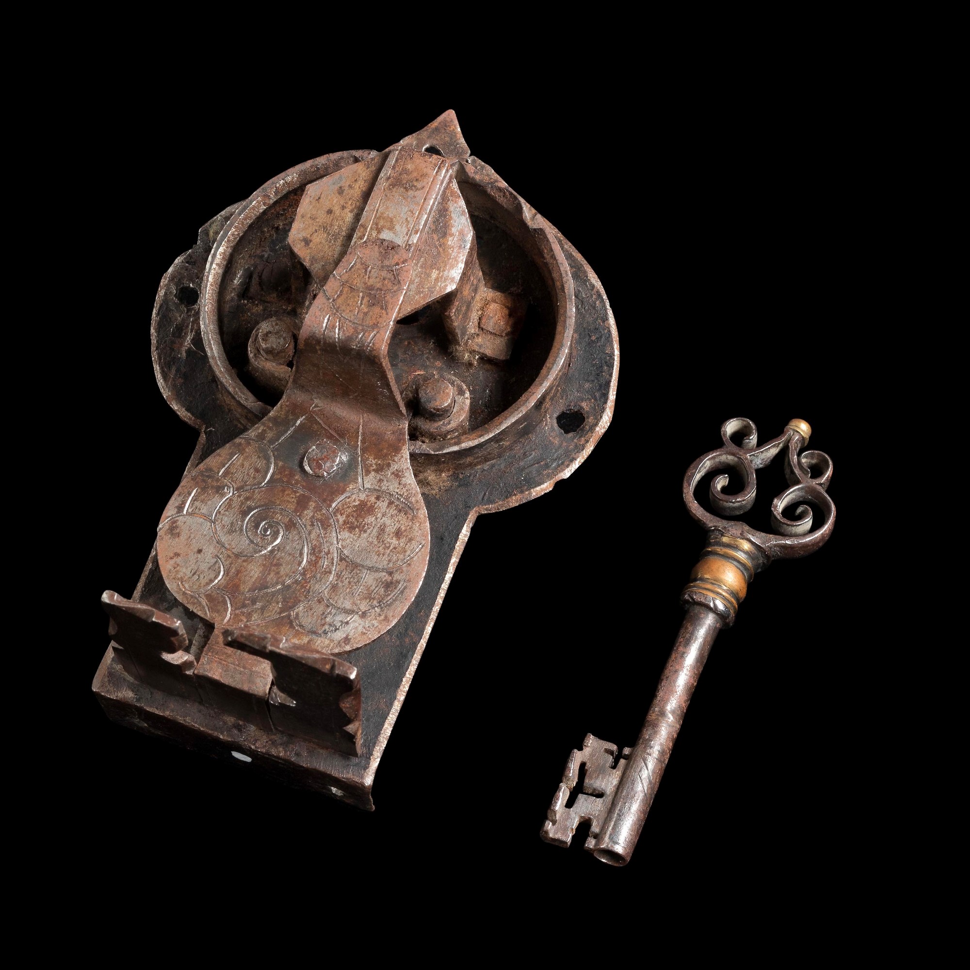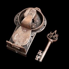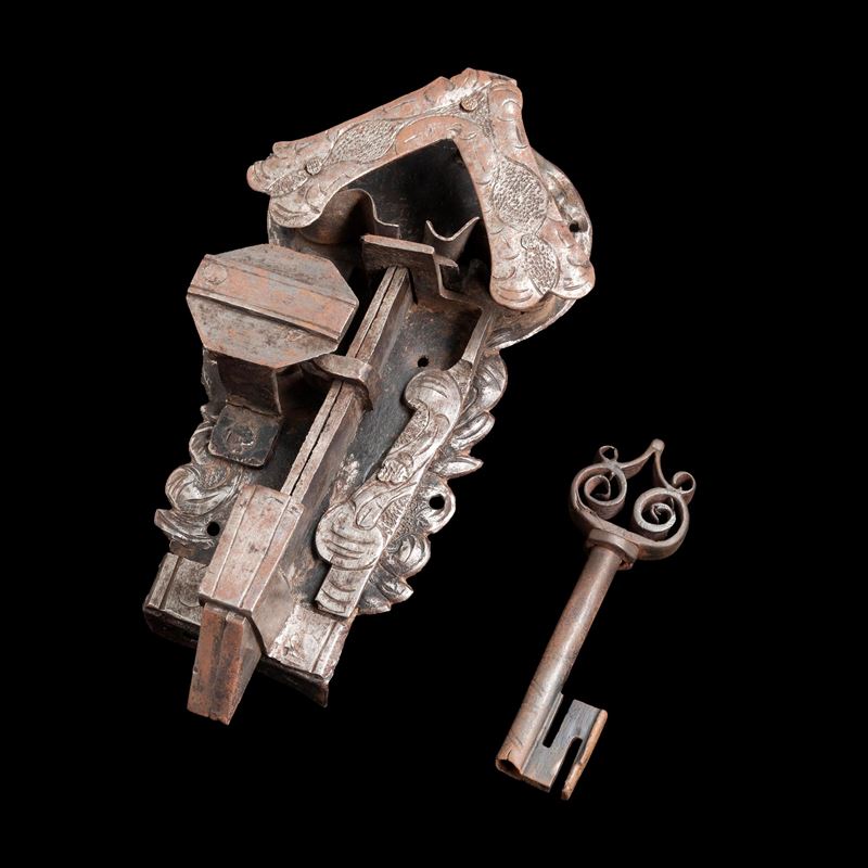 6- cm 10x6x23 serratura con ampie decorazioni in ferro sbalzato, con chiave