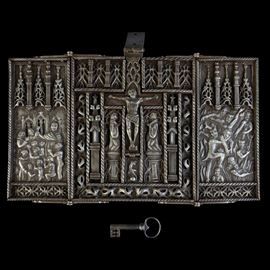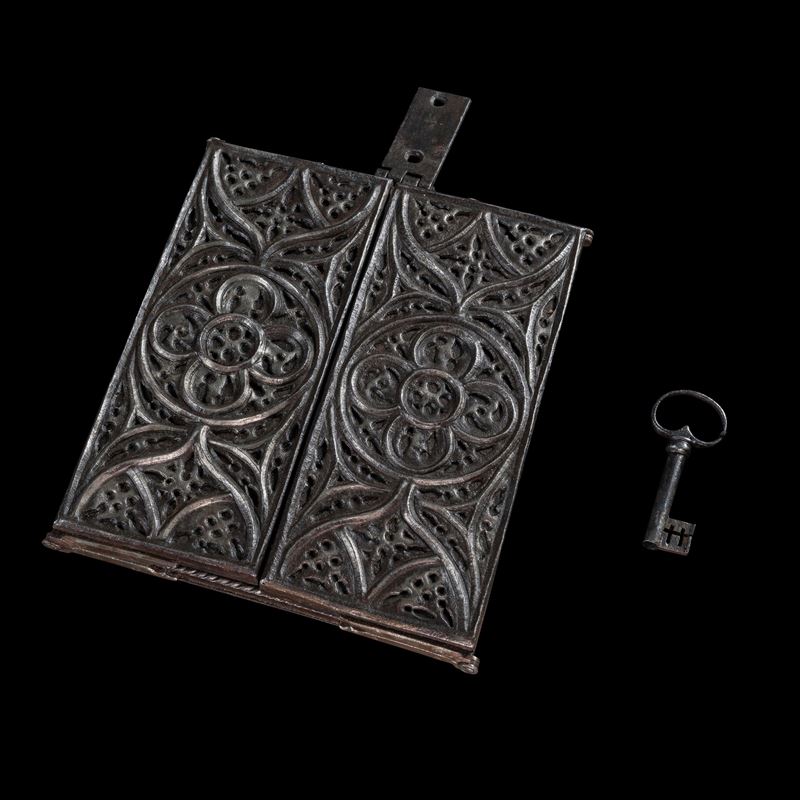 Raro esempio di serratura a libro per custodia di utensili da liturgia. Francia, probabile XV secolo