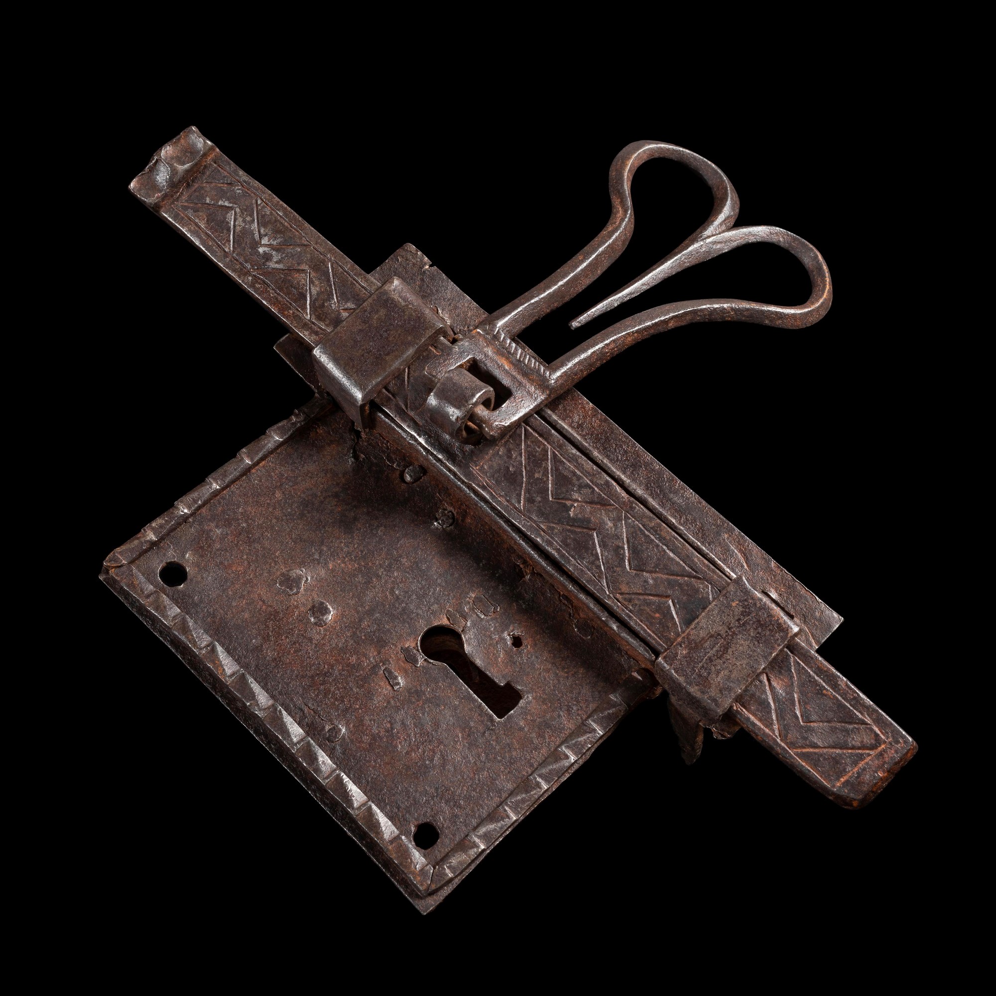 serratura a “vertevelle”, bordo scolpito, catenaccio inciso, maniglia a due lobi pieghevole da applicare all’esterno di un portone