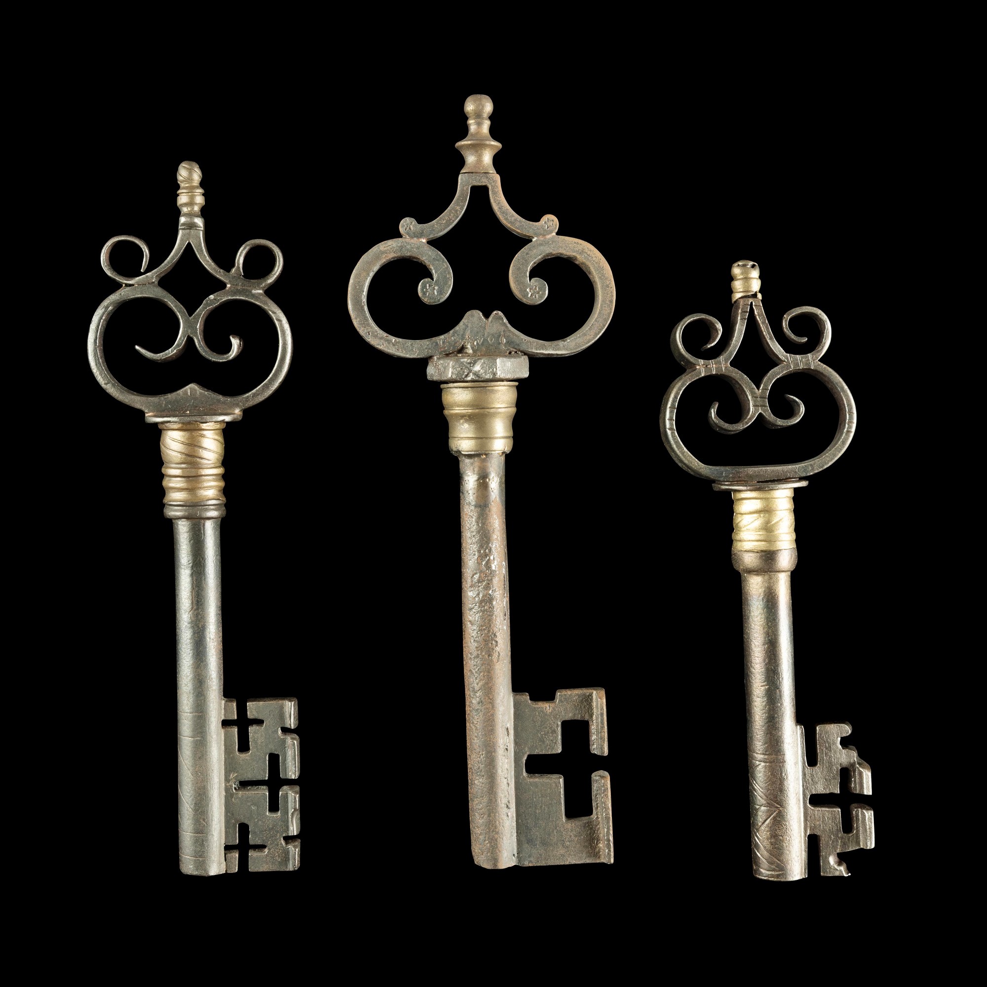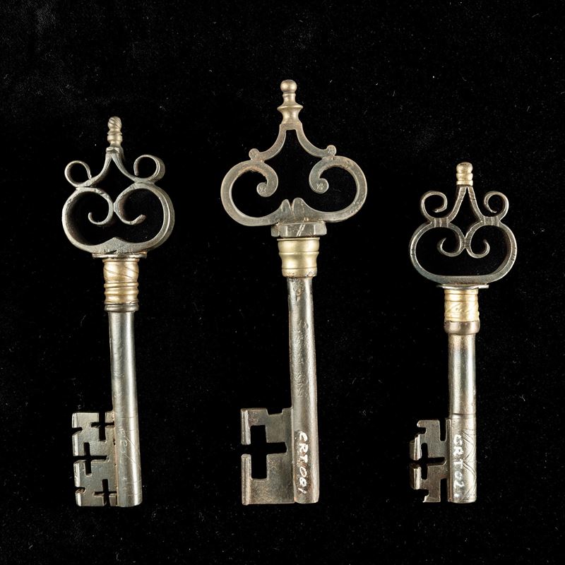 Tre chiavi rinascimentali in ferro forgiato e ottone. Alto Adige, XVI secolo