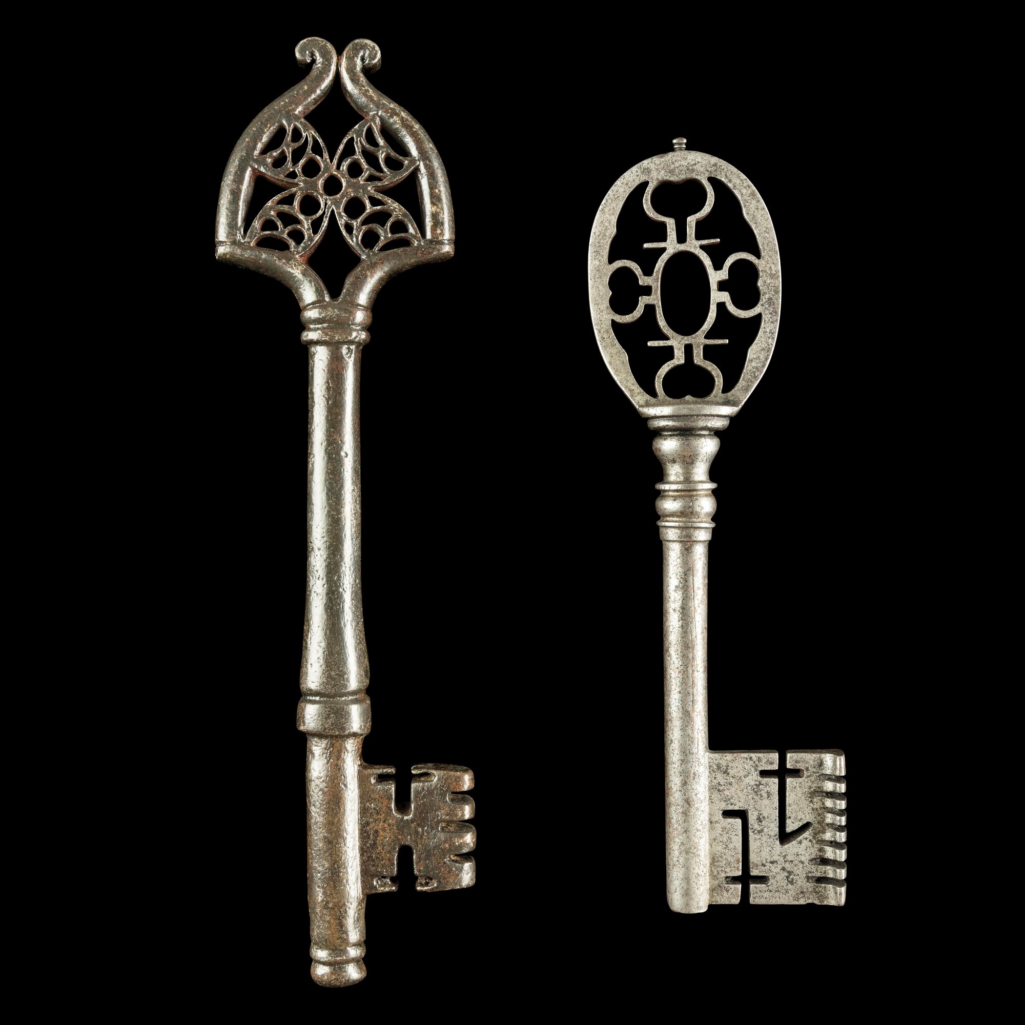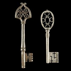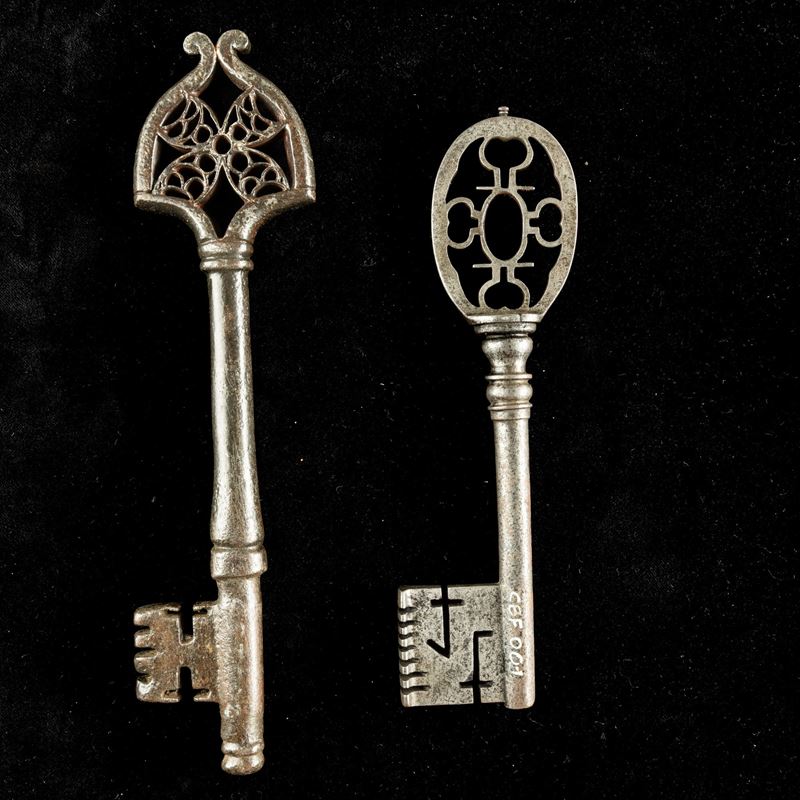 Una chiave da portone e una clé de mariage in ferro forgiato. Francia e Alto Adige, XVII secolo