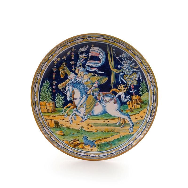 L’alzata riproduce il famoso piatto con Giuditta eseguito verso il 1510 a Cafaggiolo da Jacopo Fattorini e conservato a Londra al Victoria and Albert Museum (vedi B. RACKHAM in Catalogue of Italian Maiolica, London 1977, II, tav. 51, n. 306). Due guerriere con elmo e spada, ossia Giuditta e la sua servitrice cavalcano in un paesaggio, una, quella in secondo piano, porta in mano - quale trofeo - la testa mozzata di Oloferne. Sulla destra troviamo un trofeo militare con elementi desunti dall’antica Roma