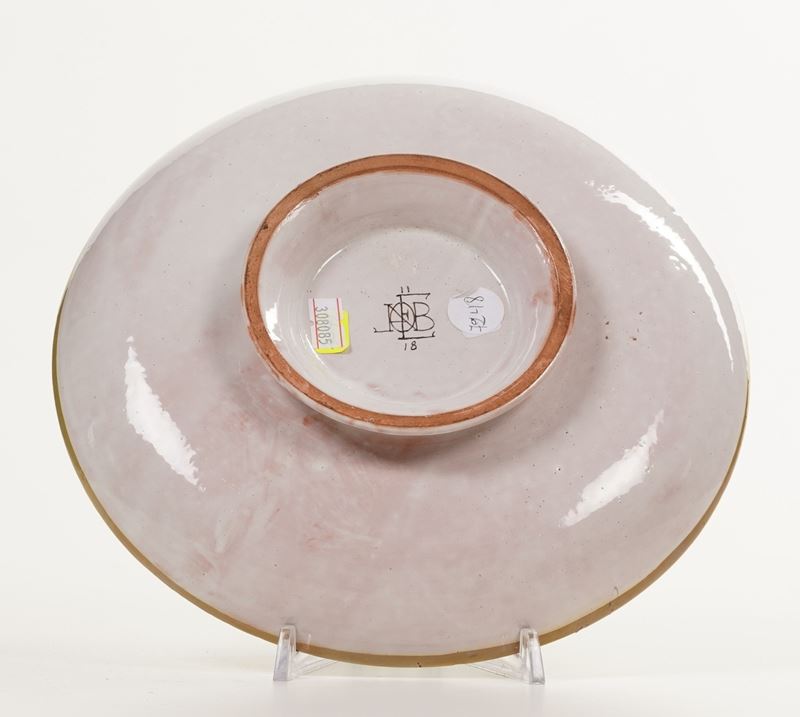 Maiolica policroma. Dimensioni: altezza cm 5,2; diametro cm 24,6. Conservazione: ottima.