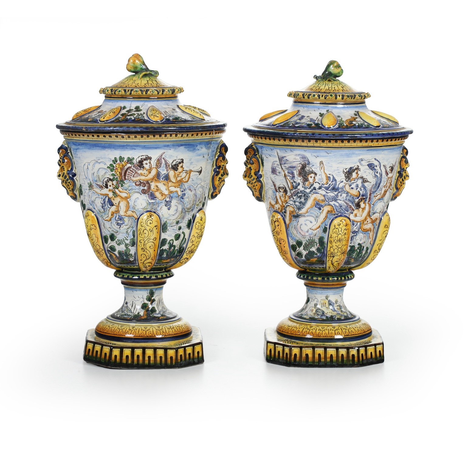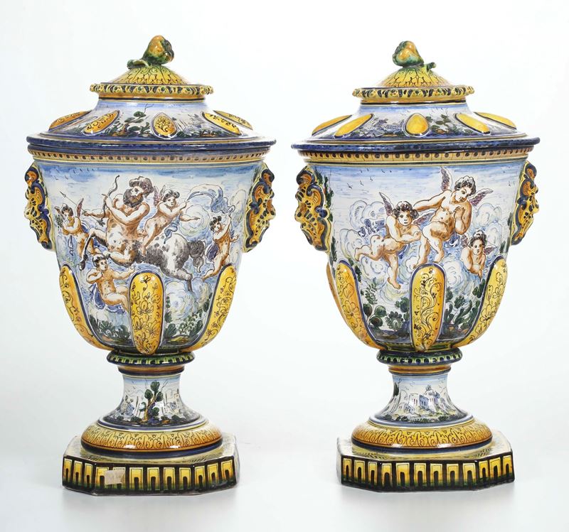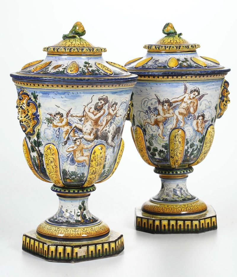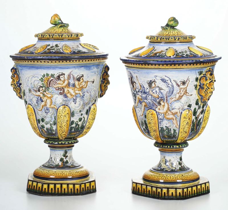 Maiolica. Marca: stemma di Savona e lettera "G". Altezza totale cm 57. Conservazione: ottima; un vaso con felatura alla base; l’altro con felature al corpo.