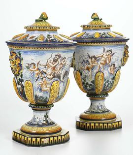 Coppia di vasi con coperchio. Liguria, probabilmente Albisola, XX secolo.