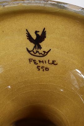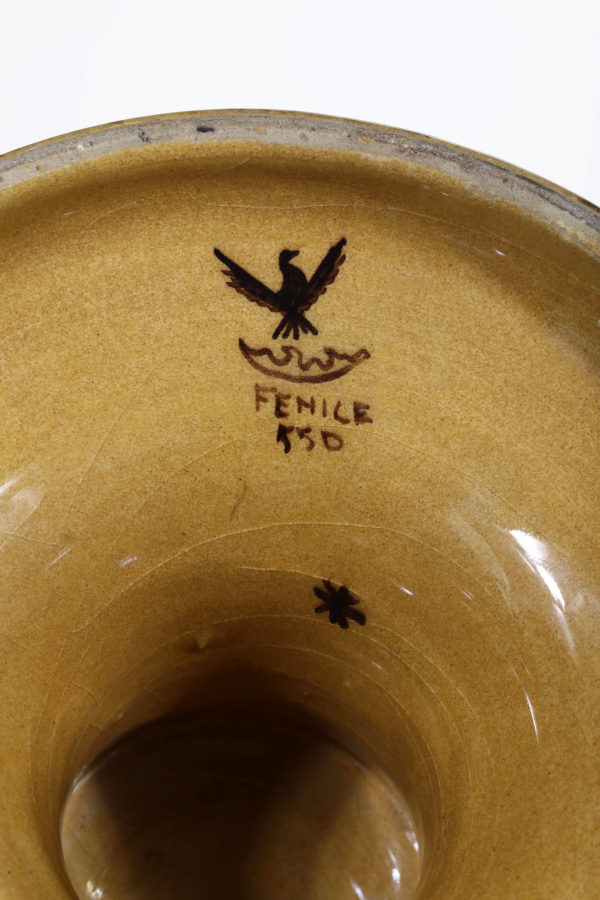 Maiolica. Marca: simbolo grafico con una fenice stilizzata che sorge dal fuoco e la scritta “Fenice Albisola”, in manganese.