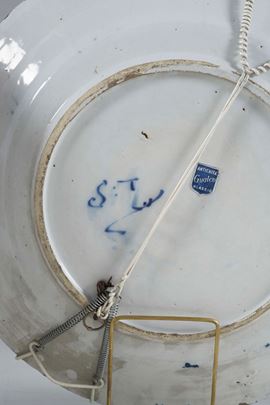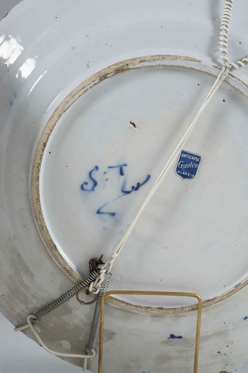 Maiolica. Marca: artiglio e "S:T" in blu. Diametro cm 31. Conservazione: un piatto con sbeccatura a bordo; cadute di smalto e piccole sbeccature