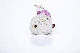 Porcellana. Marca: spade in blu dietro la base. Altezza cm 9,8. Conservazione: restauri al pesce, alla mano destra, alle dita della mano sinistra e alla punta di una scarpa; mancanze minori alla vegetazione