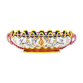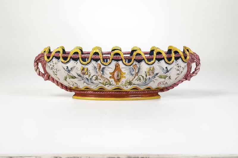 Nel pieno del gusto “Neo-rinascimentale” l’omaggio della manifattura si ha con l’elaborazione del motivo a “Raffaellesche” o a “Grottesche”, chiara reinterpretazione delle “Grottesche” che durante il Cinquecento abbellirono le dimore signorili. La doppia denominazione in ceramica deriva dal fondo bianco (“Raffaellesche”) o colorato (“Grottesche”) sul quale si distribuiscono bizzarre figure d’ispirazione fantastica, come nel caso del nostro decoro con Arpie fitomorfe intervallate da racemi sui quali posano uccellini.