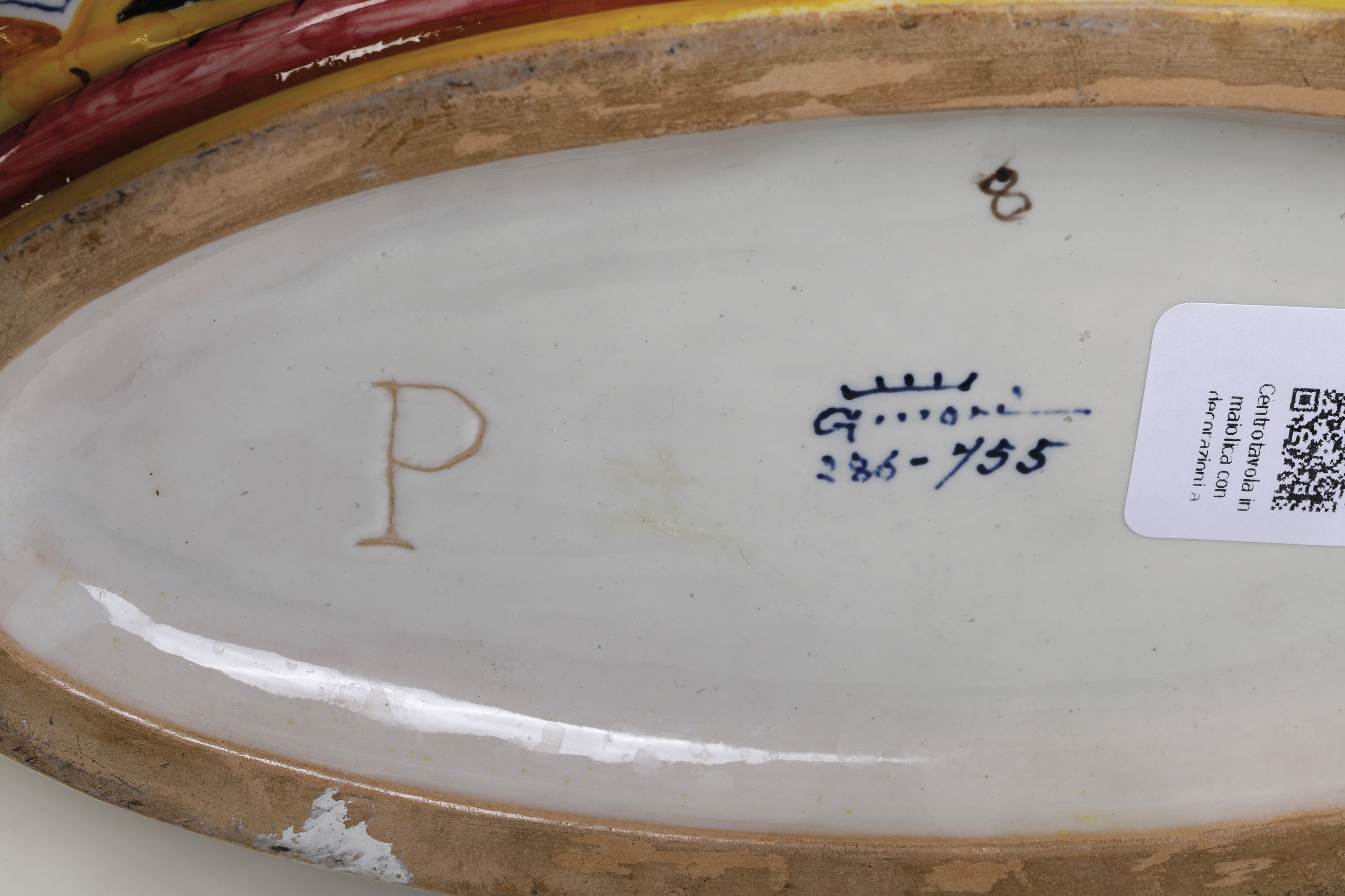 La numerazione sotto la base indica il modello (n. 286) e il decoro (n. 755), che consentono di definirne la datazione, nel nostro caso pressoché coeva, in quanto il modello è stato ideato intorno al 1881-1882, mentre il decoro risale all’incirca al 1882-1883.