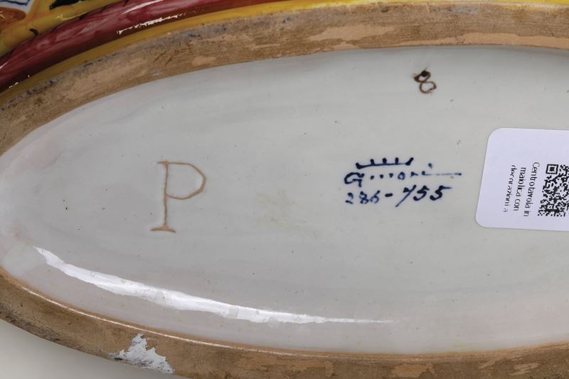 Maiolica. Marca: “Ginori” coronato in blu / 286-755; iscrizione sotto la base: “P” incisa nello smalto; “8” dipinto. Dimensioni: altezza cm 12,5; lunghezza cm 39. Conservazione: ottima; piccole cadute di smalto.