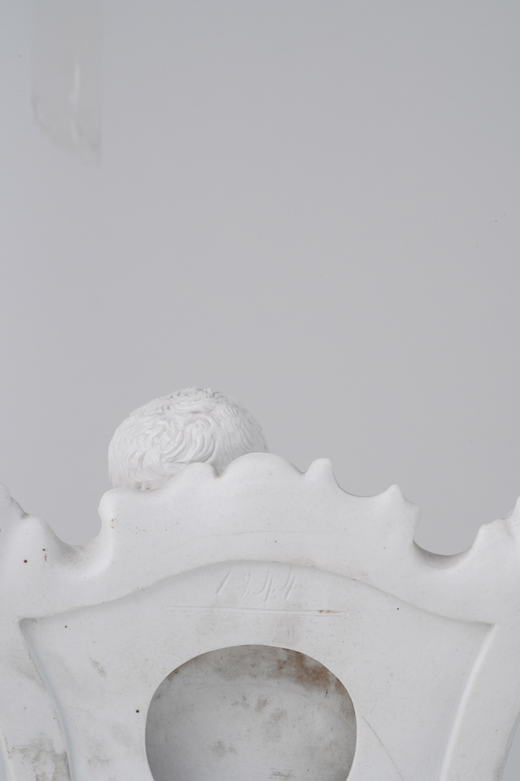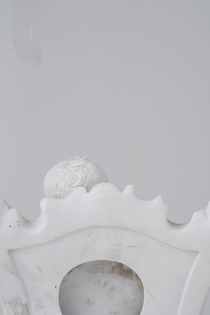 Porcellana biscuit. Marca: assente; data "1844" dietro la spalliera. Altezza cm 40,5. Conservazione: ottima; insignificanti felature avvenute, quasi esclusivamente, in fase di cottura