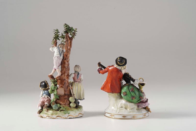 Al lotto si aggiunge un gruppo galante, in porcellana della Turingia, del XX secolo.
