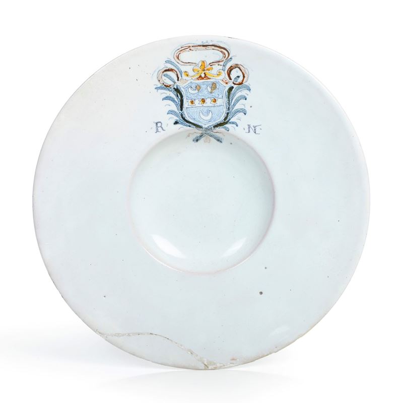 Il piatto dall'ampia tesa e profondo cavetto, è dipinto con uno stemma araldico accompagnato dalle lettere "R" e "N".