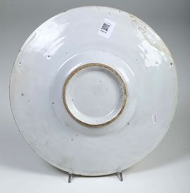 Maiolica. Diametro cm 35,3. Conservazione: rottura sula tesa incollata tra le ore 6 e le 7.