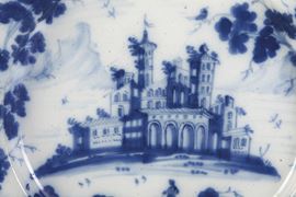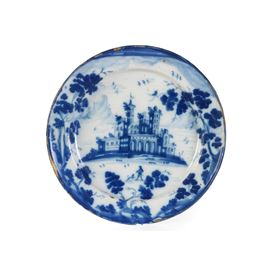 Il piatto, dalla breve tesa con bordo rialzato all’interno, è decorato in monocromia blu di cobalto su tutta la superficie con un paesaggio fantastico che ritrae grandi edifici turriti tra quinte di cespugli e alberi nascenti dal bordo, animato da un piccolo viandante con il suo cane