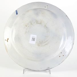 Maiolica. Marca: assente. Diametro cm 30. Conservazione: due sbeccature al bordo; piccole cadute di smalto.