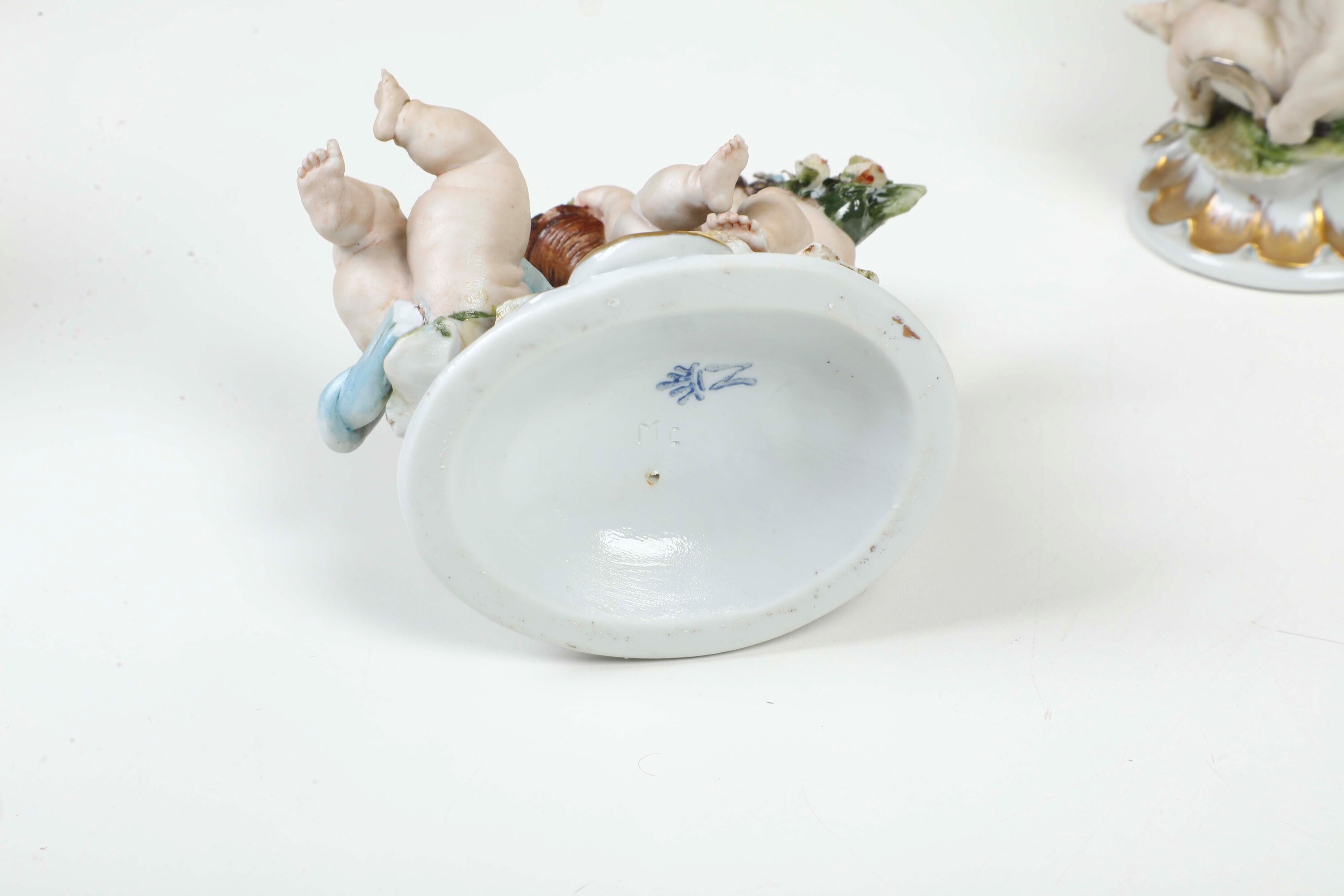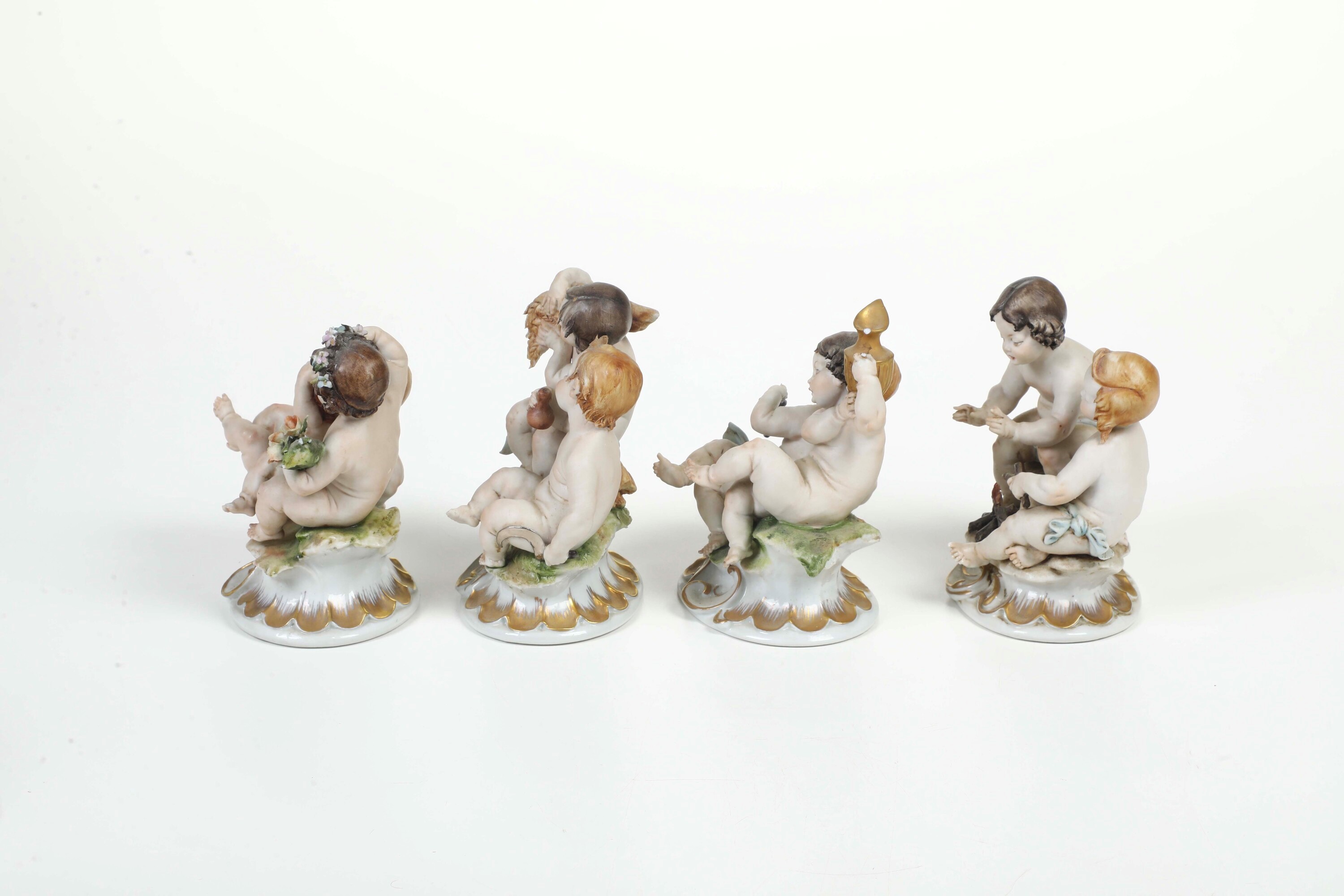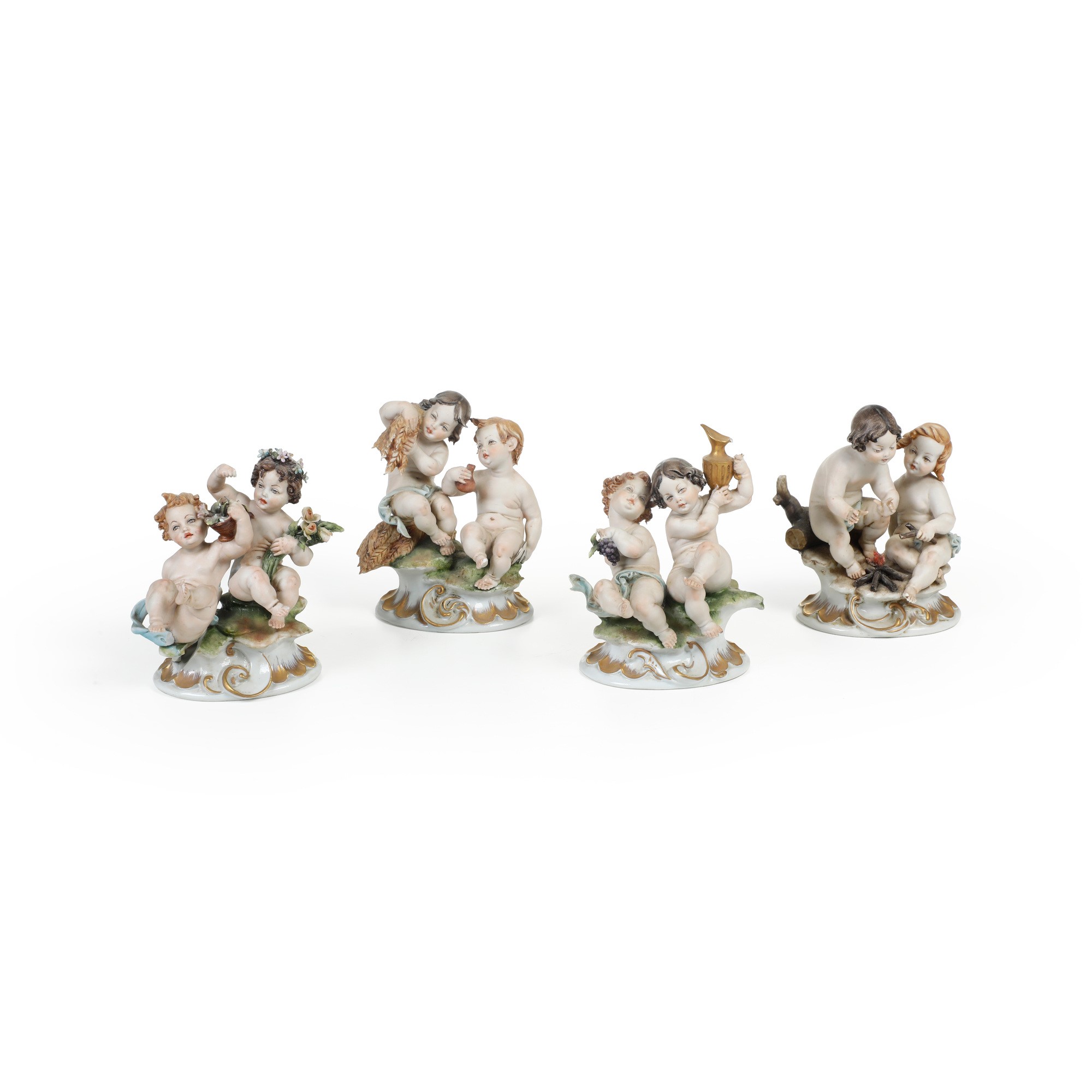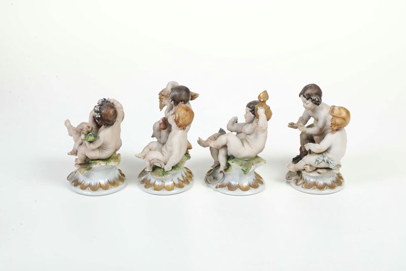 Porcellana, biscuit e smaltata. Marca: “N” con corona in blu. Altezza: cm 13,5 circa. Conservazione: in generale buona, mancanze minori. Gruppo della primavera con un putto staccato e incollato con mancanze.