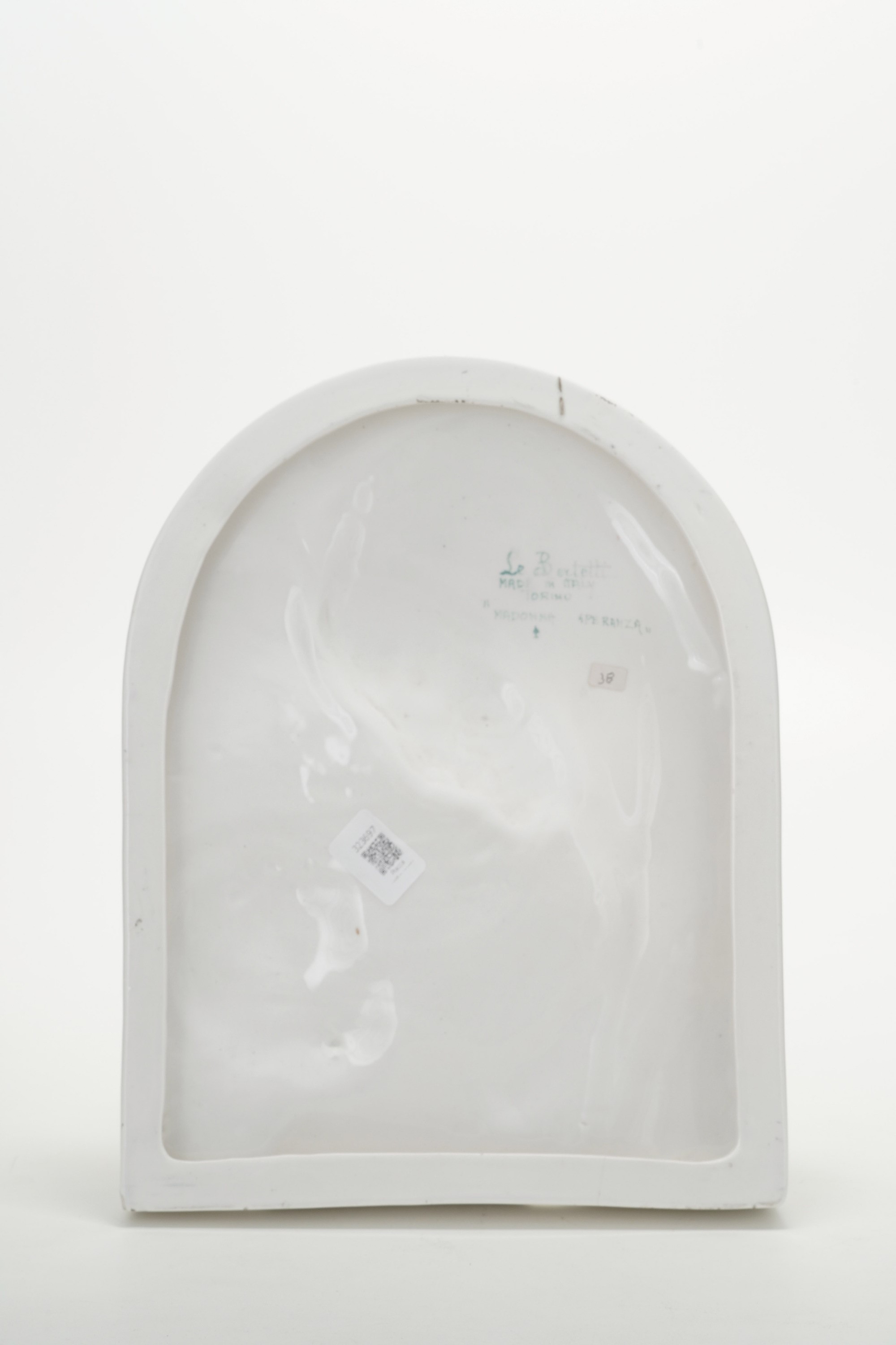 Porcellana. Marca: “Le Bertetti Torino” in verde. Dimensioni: altezza cm 37; cm 28,5x4. Conservazione: ottima; una felatura posteriormente e una piccola sbeccatura incollata sul lato superiore