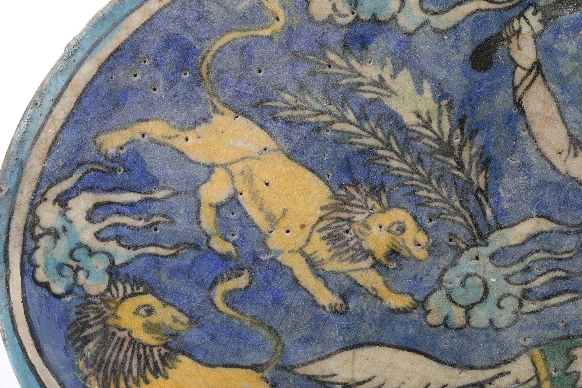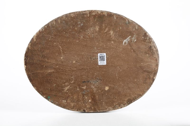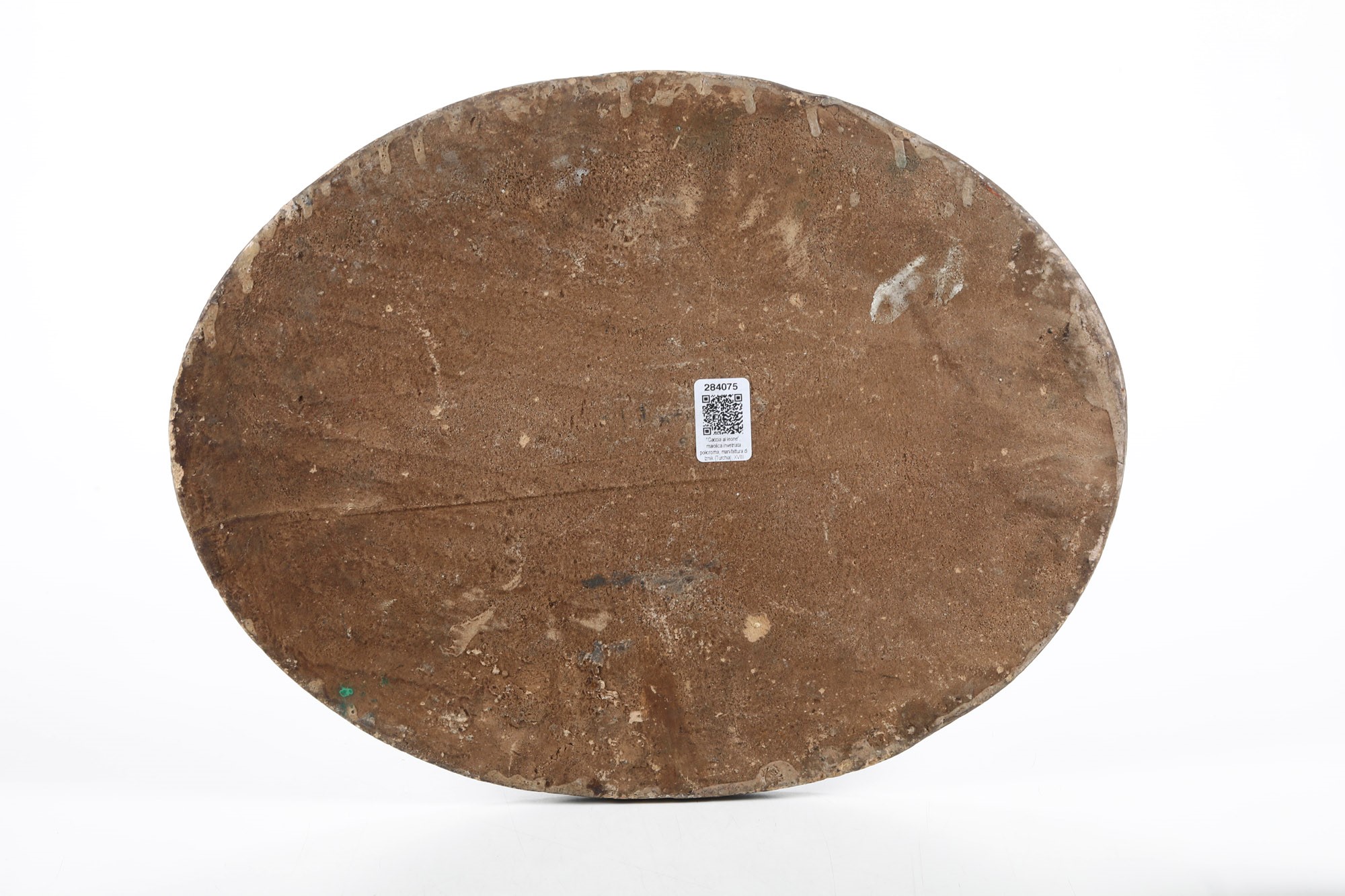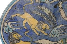 Ceramica silicea. Dimensioni: 33,6x 44,5. Conservazione: ottima; piccola ripresa in restauro al bordo alle ore 9; qualche felatura di cottura.