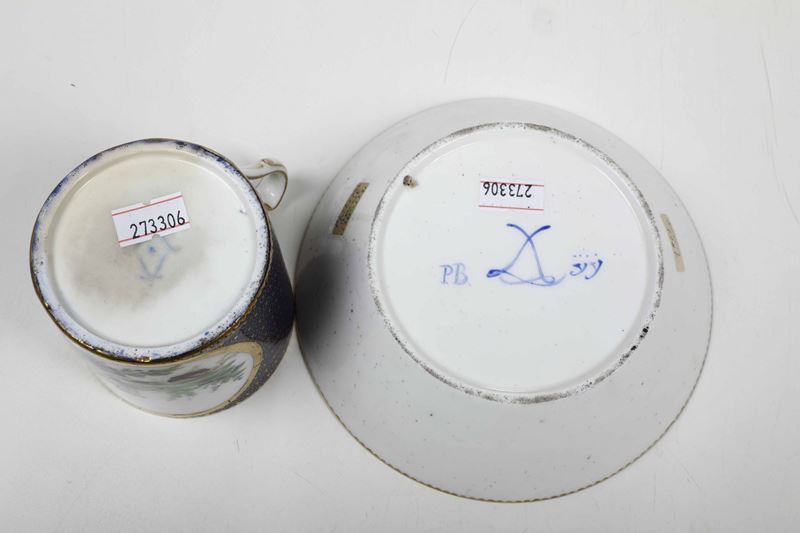 Porcellana. Marca: due "L" incrociate; sotto al piattino "PB" e "yy" in blu. Dimensioni: altezza tazza cm 7,1; diametro piattino cm 14,6. Conservazione: ottima; insignificanti usure al bordo superiore della tazza.