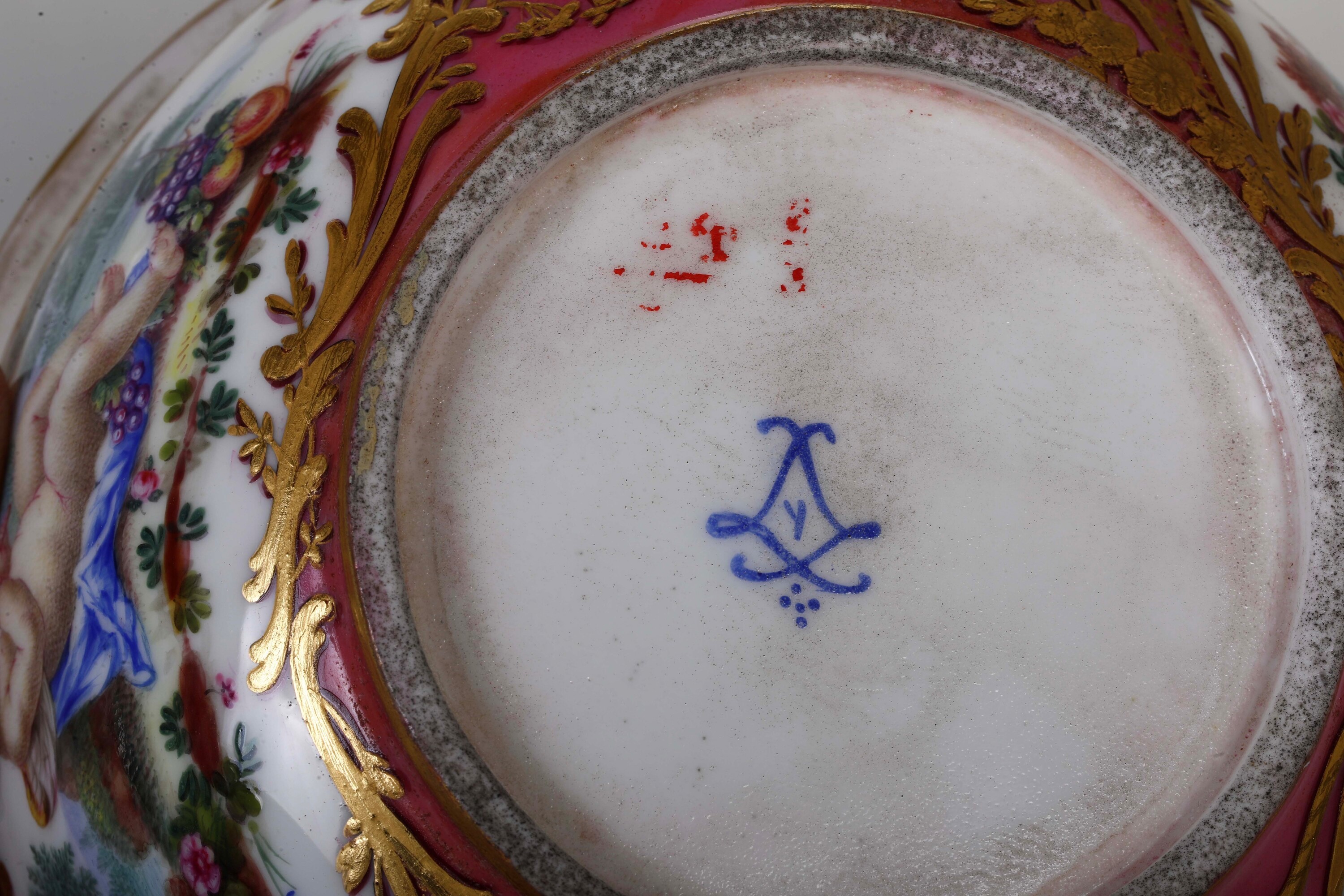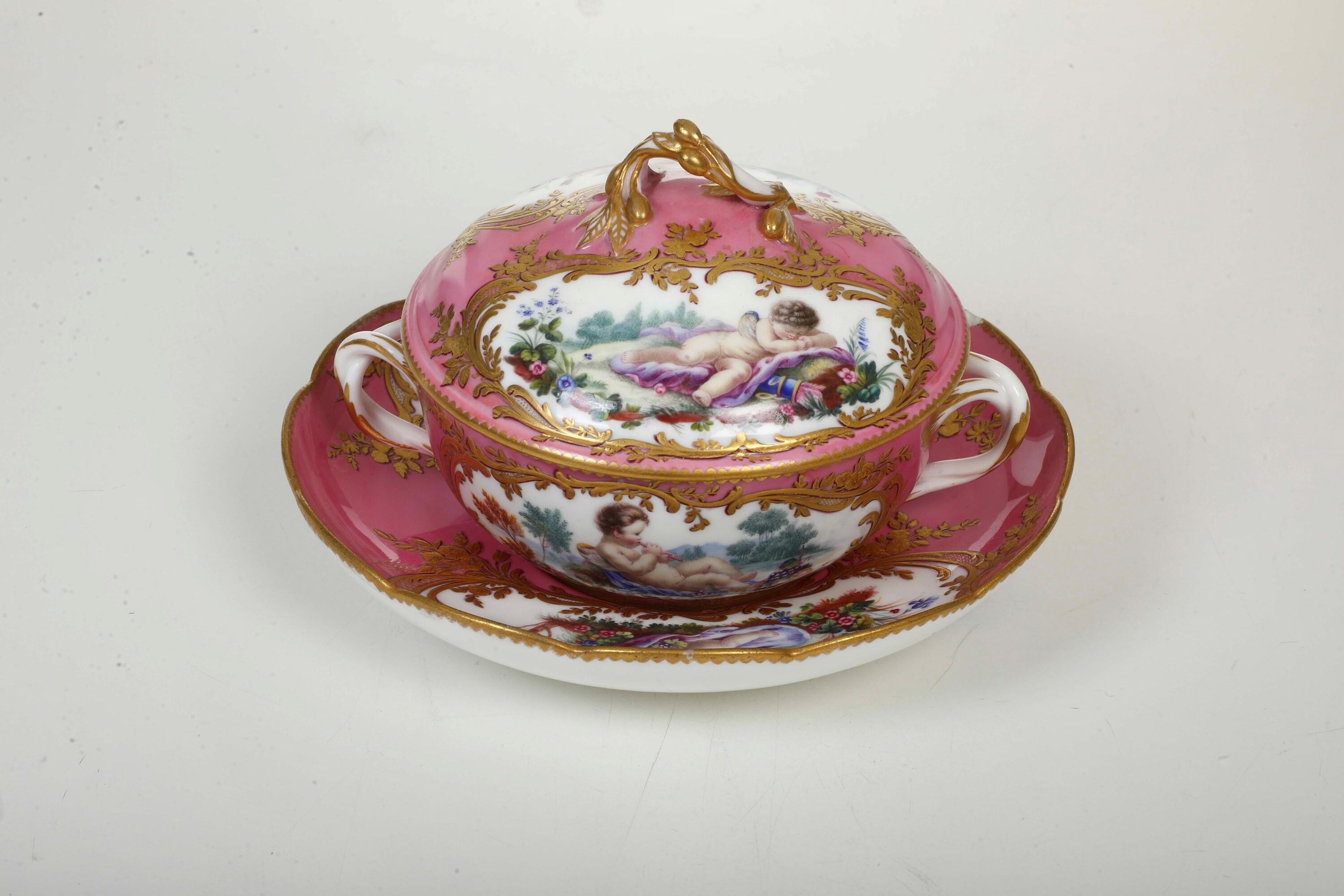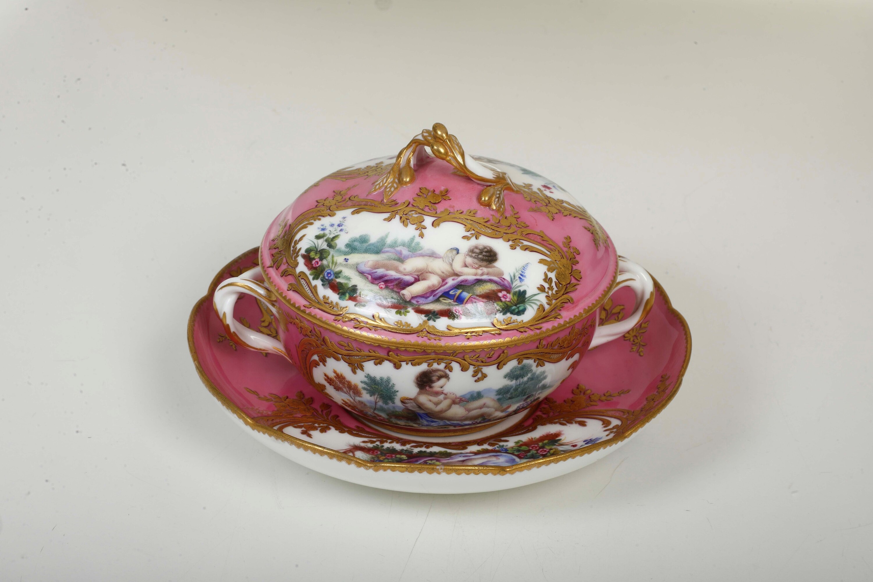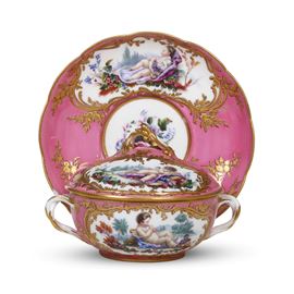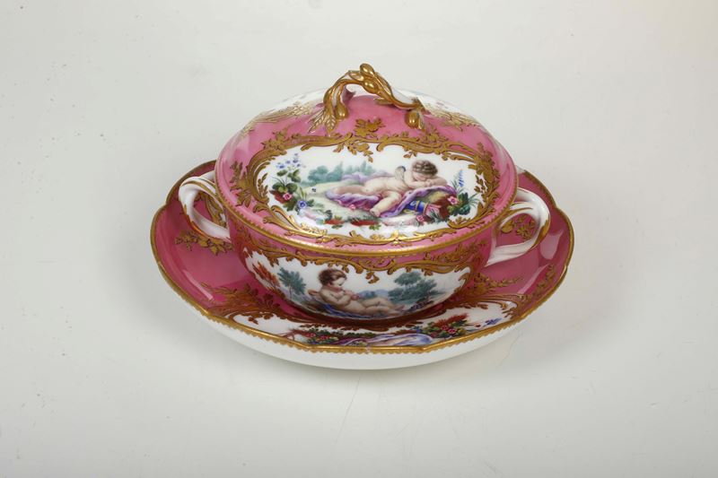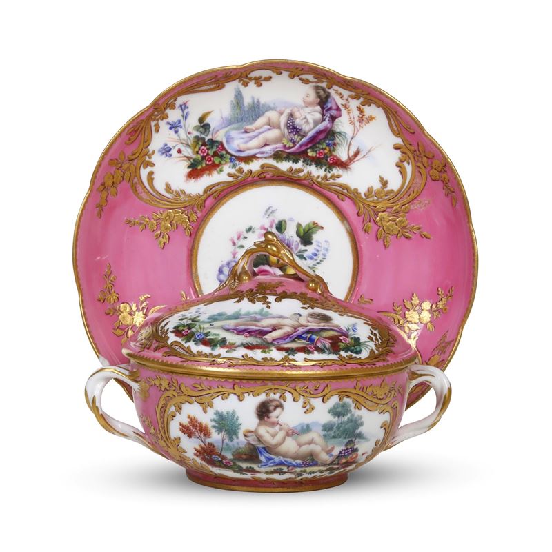 Tazza da brodo con sottopiatto. Sèvres, XVIII secolo (porcellana). Decorazione, XIX secolo.