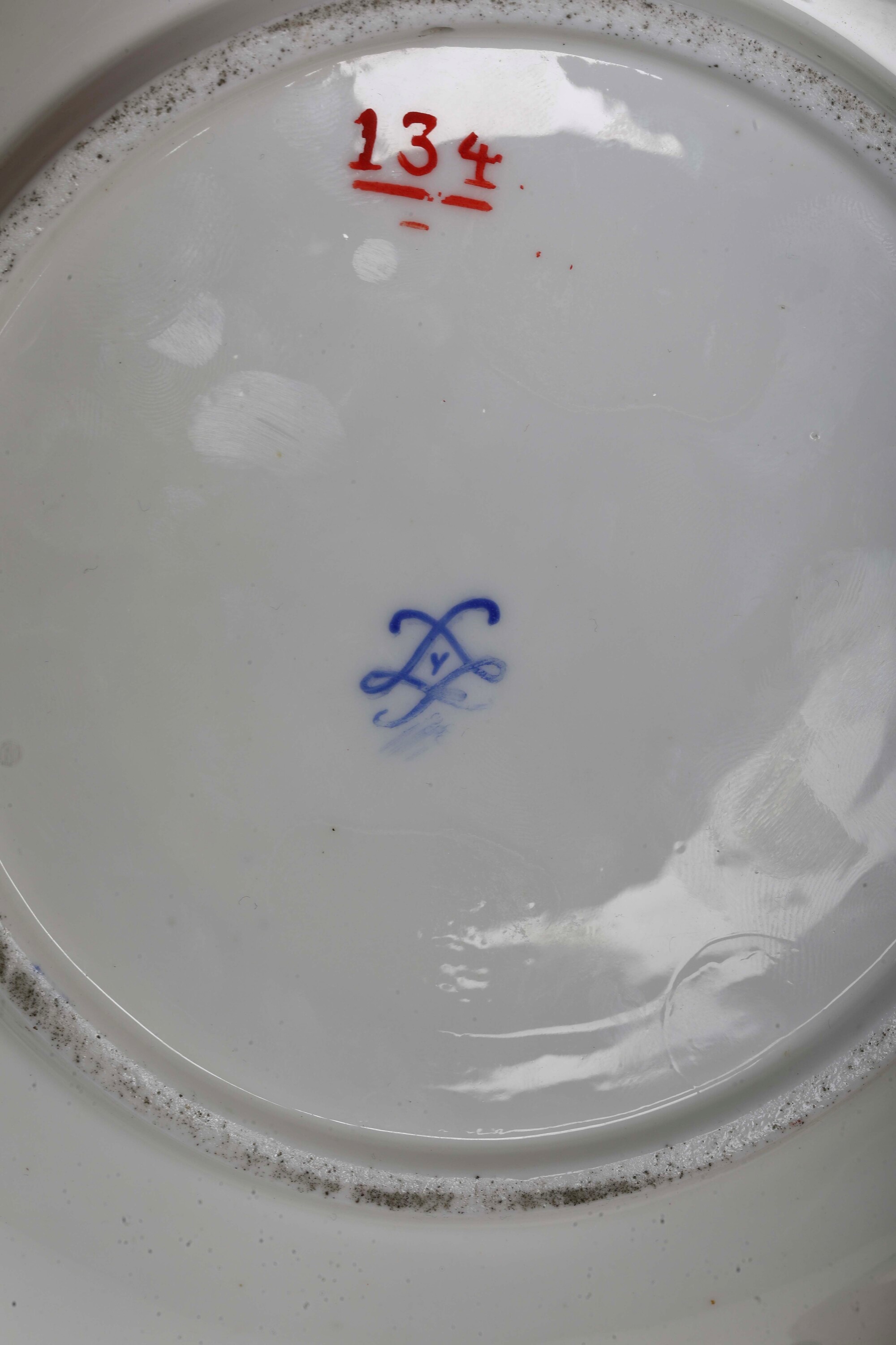 Porcellana. Marca: due “L” incrociate con lettera “Y” e cinque puntini. Dimensioni: altezza tazza cm 11,5; diametro piattino cm 19,7. Conservazione: sbeccatura al bordo del piatto; piccola felatura alla presa del coperchio