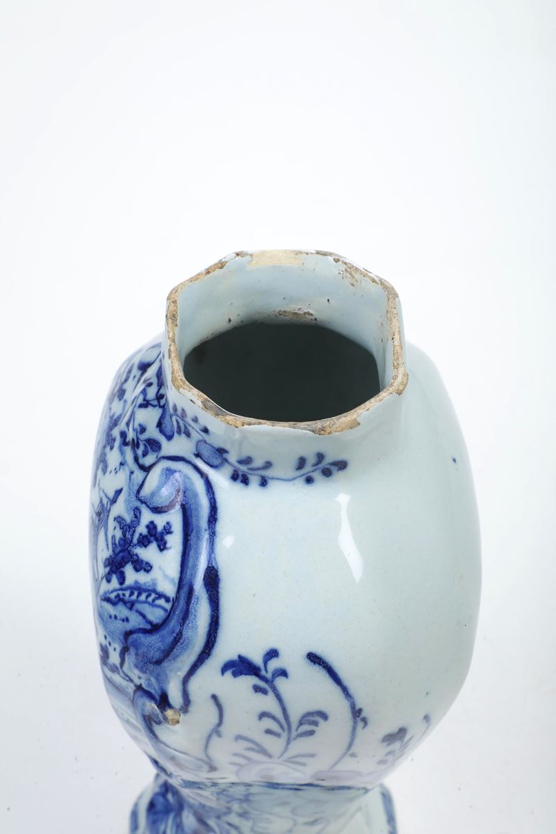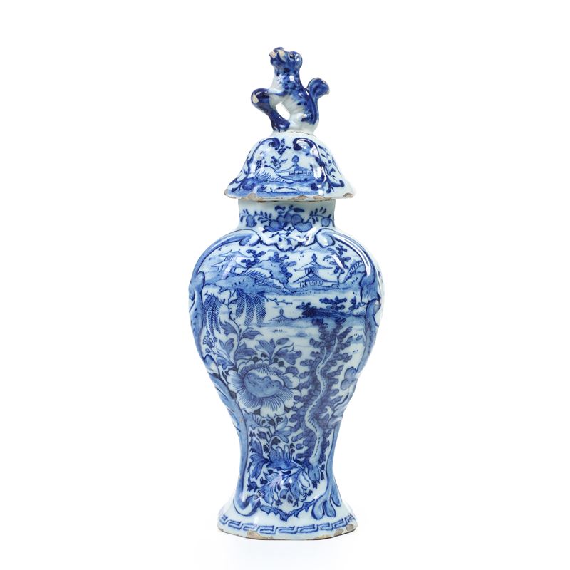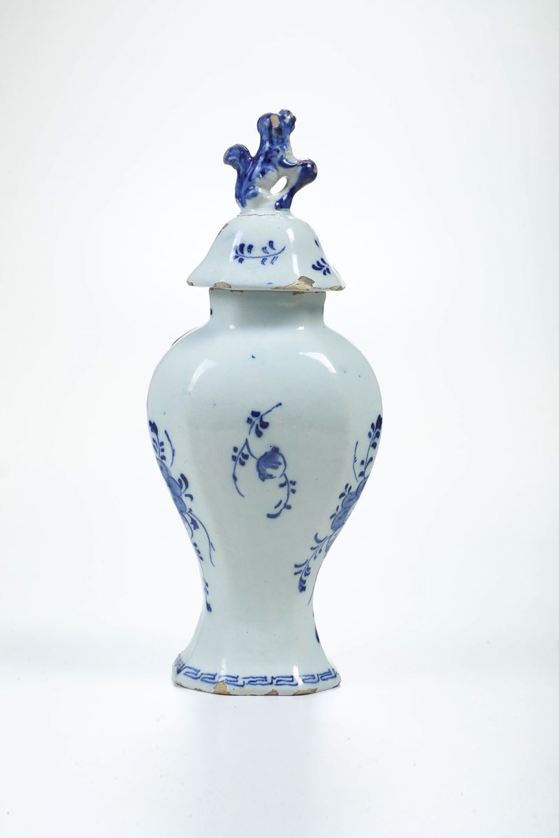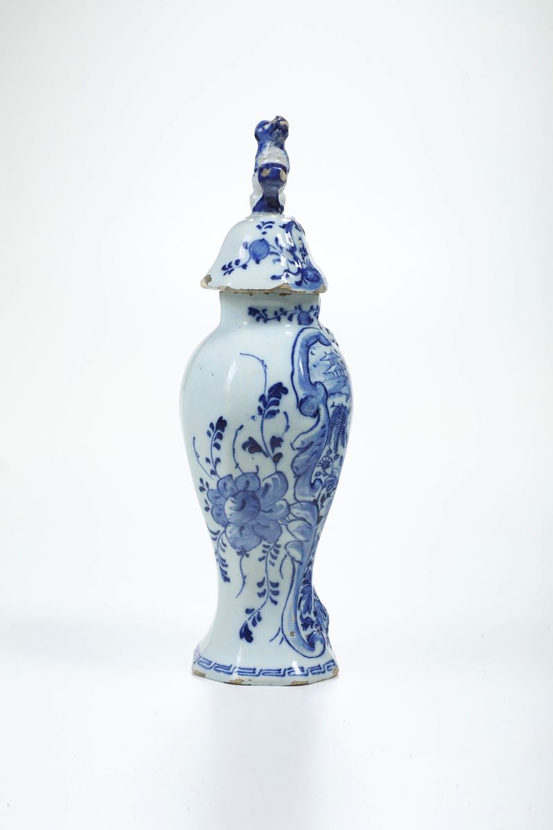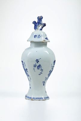 Maiolica. Marca: "LPK" in blu. Altezza: cm 33. Conservazione: presa del coperchio incollata; piccole sbeccature o cadute di smalto.
