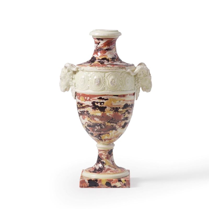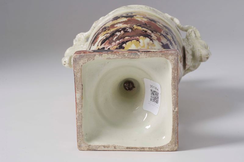 Terraglia marmorizzata. Altezza cm 34. Conservazione: ottima; una piccola sbeccatura su un corno di una presa a forma di ariete