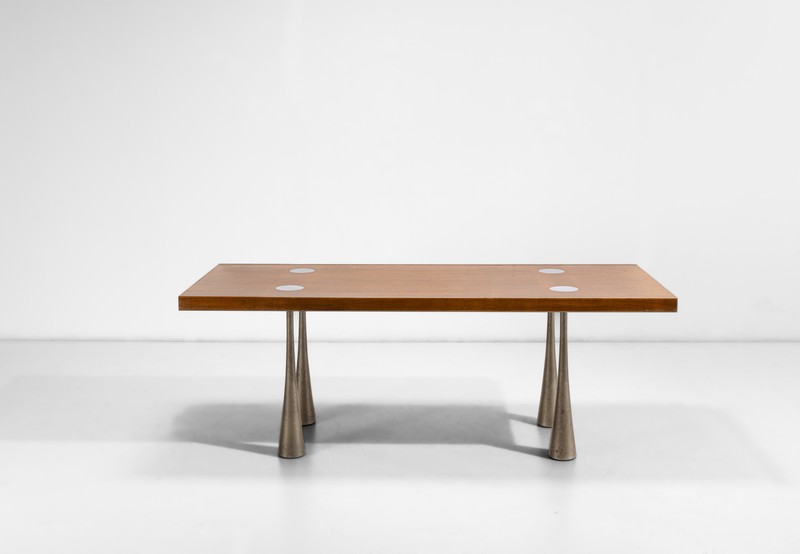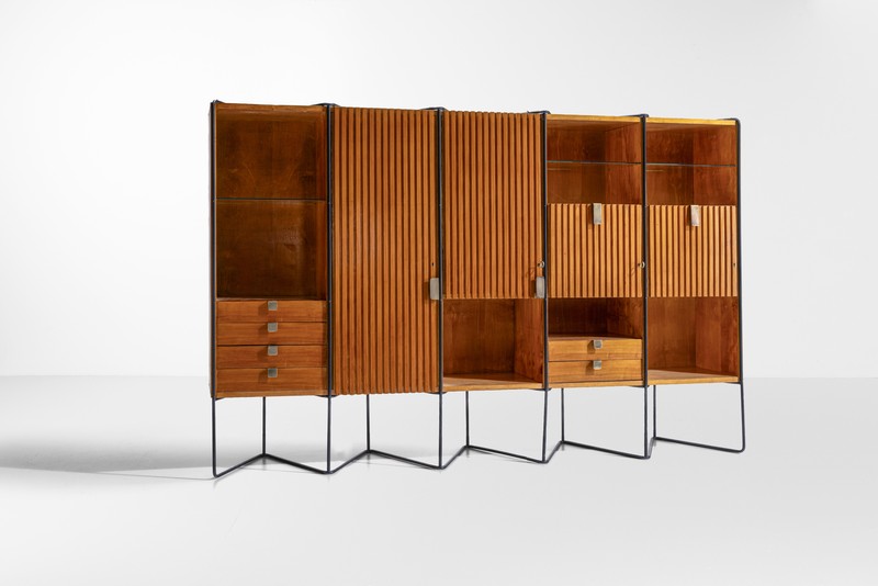 Legno e metallo sono anche gli elementi costitutivi delle creazioni di Ico Parisi e Angelo Mangiarotti: la libreria di Parisi e il tavolo di Mangiarotti riflettono perfettamente l’attenzione ai dettagli e l’innovazione tipici del design storico italiano, quella stessa attenzione che troviamo anche nel raro tessuto della serie limitata Arazzo Winter Day di Ettore Sottsass, espressione della genialità e visione artistica del grande Maestro del Novecento.