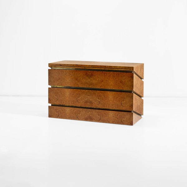 Tra gli oggetti protagonisti e più richiesti di questo appuntamento, spicca l’iconico mobile contenitore-scrittoio di Gabriella Crespi “Monsieur et Madame”, datato 1972, in struttura in legno e radica e dettagli in ottone, con marchio originale e firma incussa.