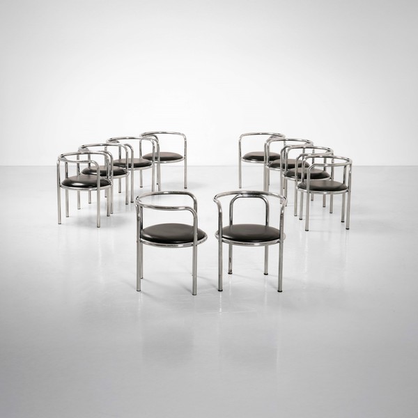 Chiude la selezione dei pezzi più rappresentativi un gruppo di dieci sedie della serie Locus Solus di Gae Aulenti, prodotte da Poltronova nel 1967. Le sedute, con struttura in metallo tubolare cromato e rivestimento in skai, testimoniano lo spirito innovativo e la libertà progettuale che hanno contraddistinto la designer nel panorama italiano del dopoguerra; anche in questo caso, la stima è compresa tra 3.000 e 5.000 euro.