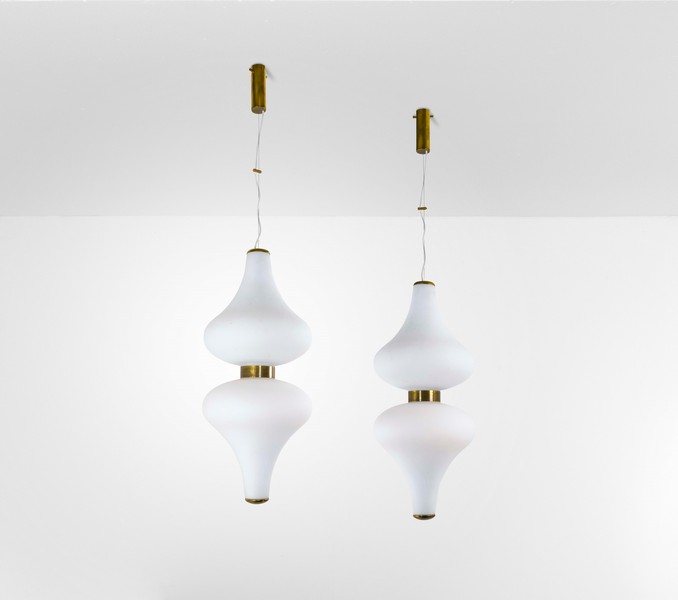 Sempre di Stilnovo, il lotto 237, due Lampade a sospensione con struttura in ottone e diffusori in vetro opalino, prodotte in Italia, sempre nel 1960 (stima: € 3.000,00 - € 5.000,00).