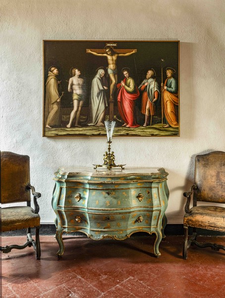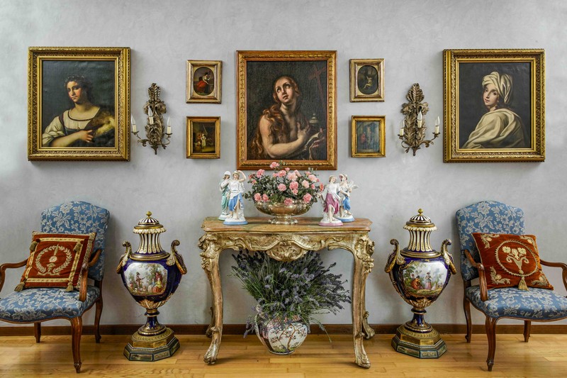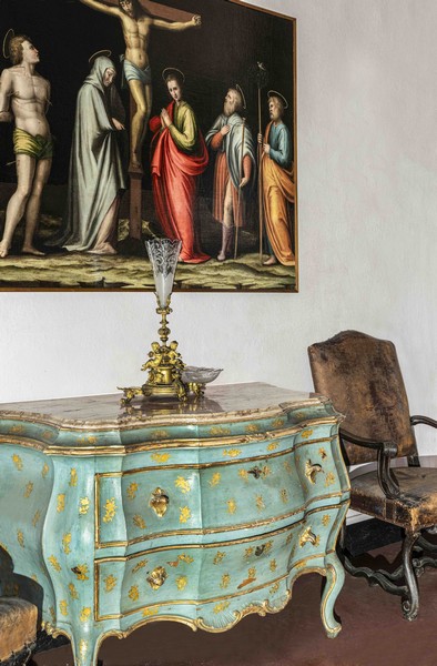 Tra i mobili e gli arredi, spiccano il cassettone a bambocci genovese del XVII secolo (€6.000-8.000), la coppia di putti con tritone d’inizio XVIII secolo (€6.000-8.000) e il grande lampadario Luigi XVI genovese in legno dorato (€3.000-4.000), veri protagonisti di un interno barocco di eccezionale ricchezza.