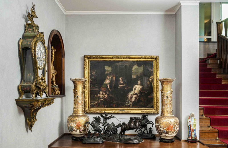 Il catalogo si apre con l’atmosfera delicata e aristocratica di una dimora sulle rive del lago di Como, dove spiccano opere di gusto settecentesco e raffinati oggetti da collezione. Tra i top lots, due grandi tele di Giovanni Jacopo Crivelli detto il Crivellino, Paesaggio con pappagallo, pavoni, gallinacei e conigli (stima €6.000-8.000) e Paesaggio con pappagallo, coniglietti e quaglie (stima: 4.000-5.000), esempi dell’eleganza naturalistica lombarda del XVIII secolo. A dialogare con i dipinti, la console napoletana del XVIII secolo in legno intagliato e argentato (€1.200-1.800) e un trumeau lombardo in noce e radica di noce (€6.000-8.000), testimonianze di un gusto decorativo colto e armonioso. Tra i lotti più rappresentativi anche l’Adorazione dei Pastori di Ignazio Stern, pittore barocco di origine austriaca attivo a Roma, offerta con una stima di €8.000-12.000.