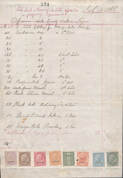 Un altro pezzo degno di nota è il lotto 172, un foglio del 13 luglio 1866 contenente otto prove su carta filigranata con soprastampa "SAGGIO" dei francobolli De La Rue. Questo documento, inviato alle Officine Carte Valori di Torino, ha un significato storico unico per il Regno d’Italia.