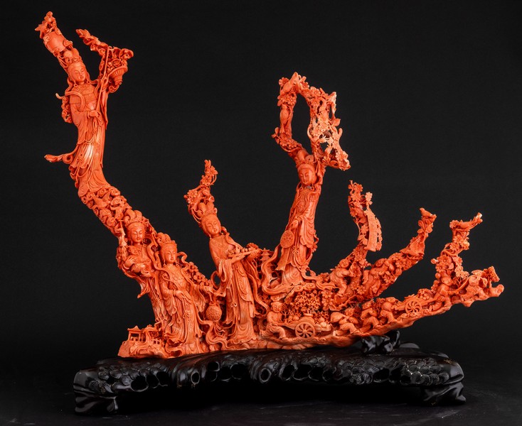 Tra i lotti di maggior rilievo spicca un importante e monumentale corallo rosso scolpito, straordinario esempio della maestria artigianale cinese del XIX secolo sotto la Dinastia Qing. L’opera, che raffigura Guanyin circondata da fanciulle e vegetazione, arricchita da iscrizioni, si impone come simbolo di raffinatezza artistica ed è presentata in catalogo con una stima di 70.000 – 100.000 euro.