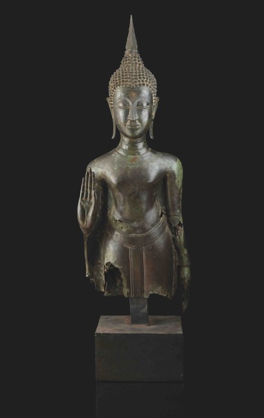 Tra i lotti di maggiore rilevanza segnaliamo una straordinaria figura di Maitreya scolpita in pietra del IV secolo, risalente al regno di Gandhara, corrispondente all’attuale Pakistan settentrionale e Afghanistan orientale (stima: € 40.000); una testa di Bodhisatwa scolpita in pietra del IV secolo, sempre a Gandhara (stima: € 25.000); e uno scroll su carta titolato Granchi del pittore Qi Baishi, realizzato con inchiostro su carta, iscritto e firmato con il sigillo dell'artista (stima: € 25.000). Notevoli anche un’imponente figura di Mahamayuri, XII anno del periodo di Kangxi (1662-1722) in bronzo dorato con iscrizioni postume (stima: € 15.000), e una monumentale figura di Buddha in bronzo del XV secolo proveniente dalla Thailandia del periodo Sukhaotai (€ 15.000).