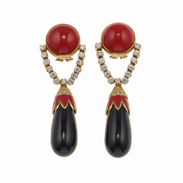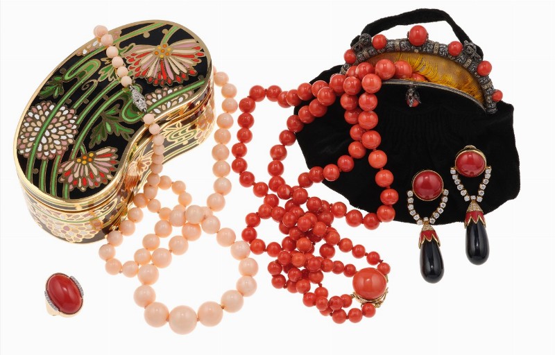 Nella prima tornata, dedicata ai coralli, segnaliamo il lotto 68, un paio di orecchini pendenti con diamanti, corallo e onice, firmati Nardi (stima €9. 000 - €12.000), il lotto 67, una lunga collana di corallo, a due fili, con boules scalari (stima €18.000 - €20.000) e il lotto 75, una bella collana in corallo rosa (stima €20.000 - €25.000).