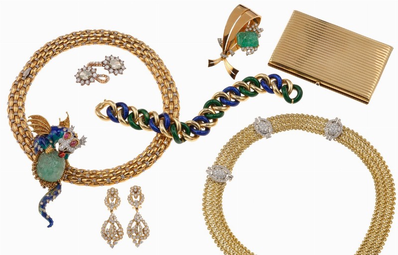 Menzioniamo, inoltre, una piccola raccolta di portaoggetti firmati Alfredo Ravasco (lotti 352 - 354), una collezione di scatole in oro, smalti e gemme (lotti 120-135), cui si aggiunge una selezione di gioielli provenienti dall’atelier Martignetti di Milano. Tra questi, segnaliamo la spilla “Il giullare”, in oro, platino e diamanti (lotto 159, stima € 11.000 - €13.000) e la spilla “Fascio di luce” in oro, platino e diamanti (lotto 160, stima € 14.000 - € 15.000).