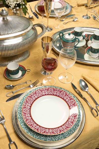 Tra i 447 lotti in asta ricordiamo il coloratissimo servizio Marqueterie de Pierres dures d'Orient et d'Occident di Hermès (stima: €8.000 – €12.000), ideato nel 1989 e decorato con un’ampia varietà di motivi, dai fiori agli uccelli, a frutti e collane di perle, ispirati alla lavorazione delle pietre dure durante il Rinascimento a Firenze. Un servizio da 8 persone della Manifattura Ginori con la decorazione – già introdotta nel primo decennio di attività della fabbrica – a “paesi rossi” e incorniciatura a “ova tagliate” su fascia blu e ghirlanda di vitalba dorata (stima: €12.000 – €24.000).
